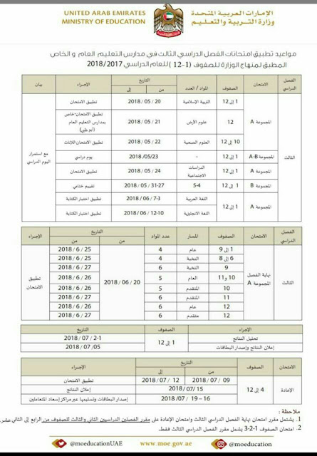 اصدرت وزارة التربية والتعليم في الامارات جدول مواعيد الامتحانات وتم تضمين ماتم دراسته في الفصلين الاول والثاني