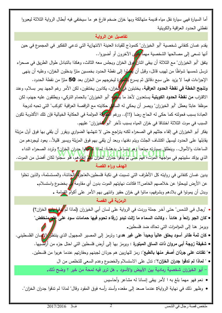 معلومات الملف: الصف الثاني عشر، الفصل الثالث, لغة عربية، 2017-2018، تلخيص نهائي رواية رجال في الشمس | |||