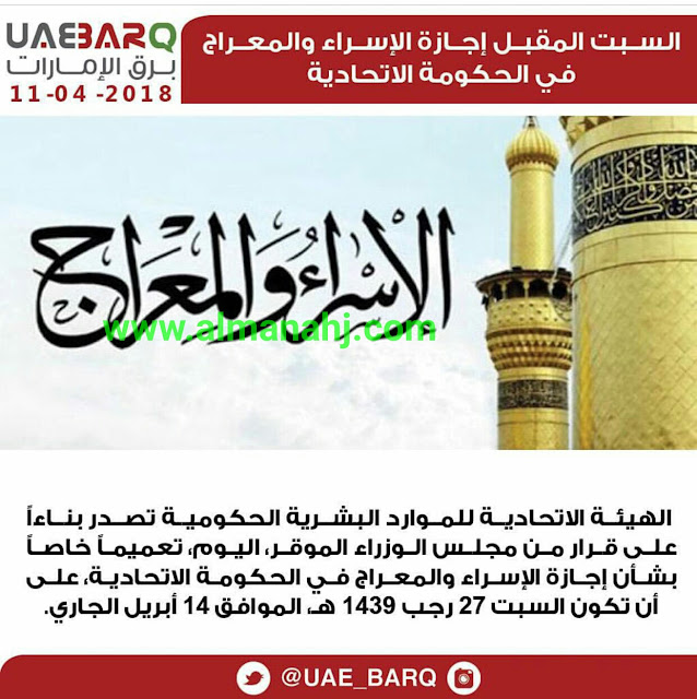 حددت الهيئة الاتحادية للموارد البشرية الحكومية في الامارات العربية المتحدة موعد تجازة الاسراء والمعراج وذلك في يوم السبت 27 رجب 1439هجري الموافق 14 ابريل الجاري. | ||