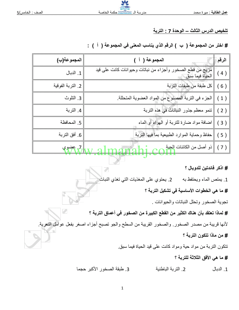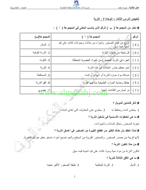 معلومات الملف: الصف الخامس, الفصل الثالث, علوم, 2017-2018, تلخيص الوحدة7 التربة | |||