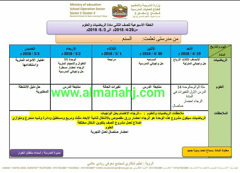 2. الخطة الاسبوعية لمادتي الرياضيات والعلوم للصف الثاني من 16 الى 20 الشهر