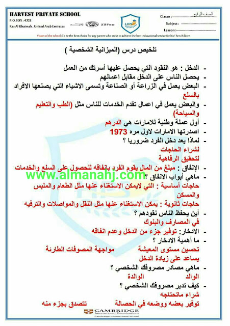 معلومات الملف: الصف الرابع, الفصل الثالث, اجتماعيات, 2017-2018, تلخيص درس الميزانية الشخصية | ||