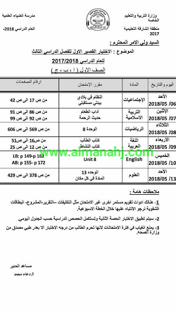 جدول امتحان التقويم الأول للصف الاول في مدرسة الضياء الخاصة | ||