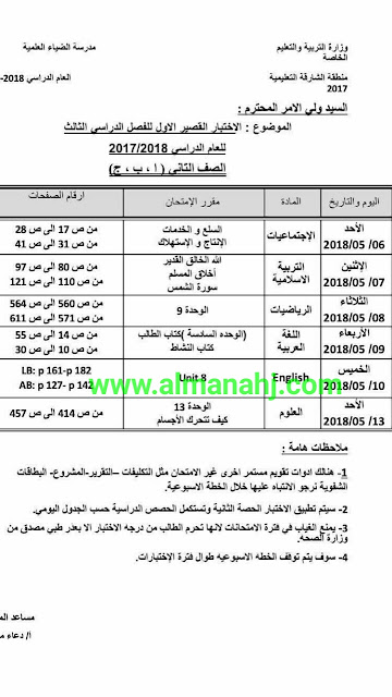 اليكم جدول امتحان التقويم للصف الثاني في مدرسة الضياء الخاصة- الفصل الدراسي الثالث من العام الدراسي 2017-2018 | ||