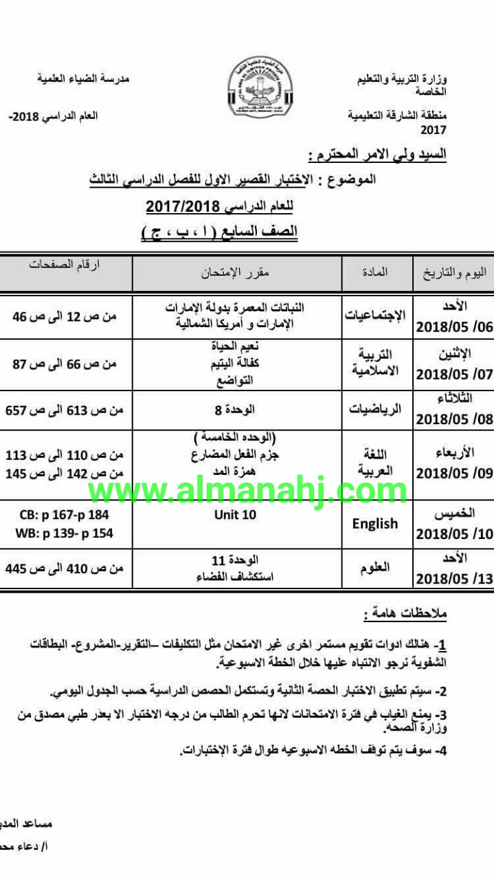 جدول امتحان التقويم الأول للصف السابع في مدرسة الضياء الخاصة | ||