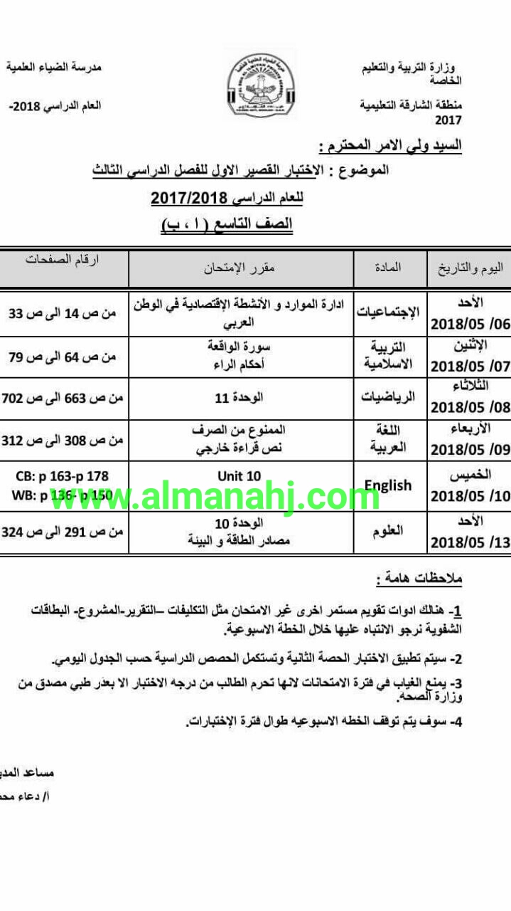 | جدول امتحان التقويم الأول للصف التاسع في مدرسة الضياء الخاصة | ||