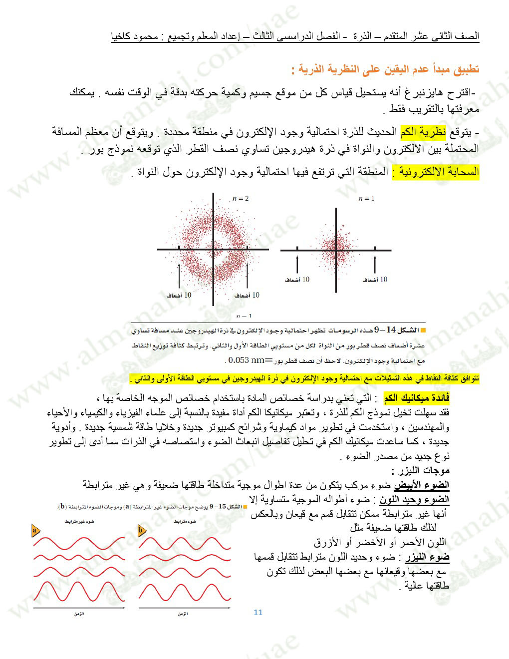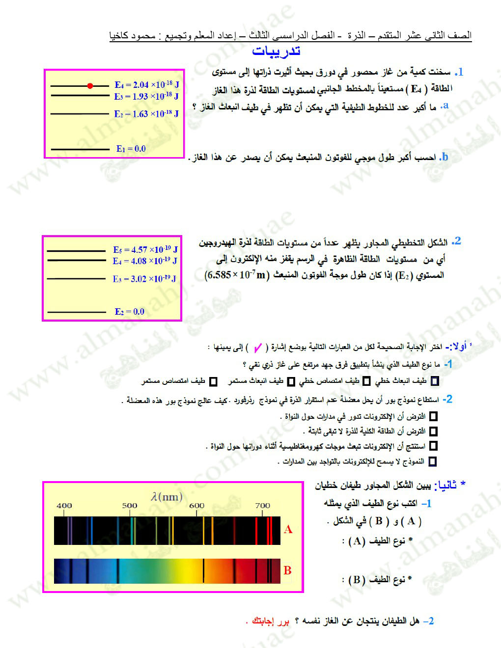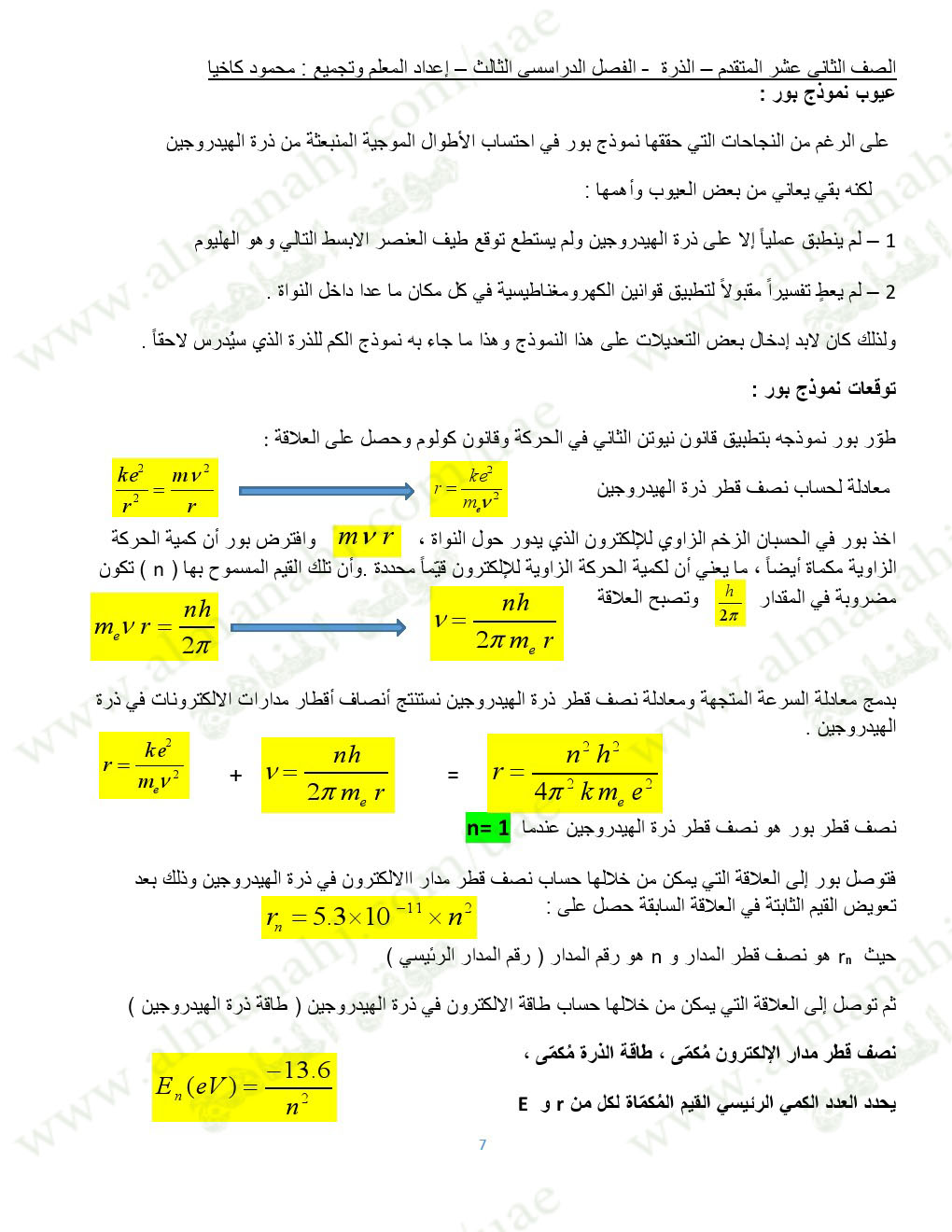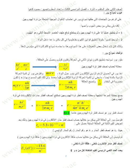 معلومات الملف: الصف الثاني عشر المتقدم, الفصل الثالث, فيزياء, 2017-2018, ملخص مميز للذرة | |||