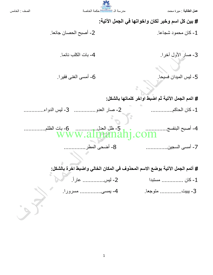 معلومات الملف: الصف الخامس, الفصل الثالث, لغة عربية, 2017-2018, تدريبات كان واخواتها | |||