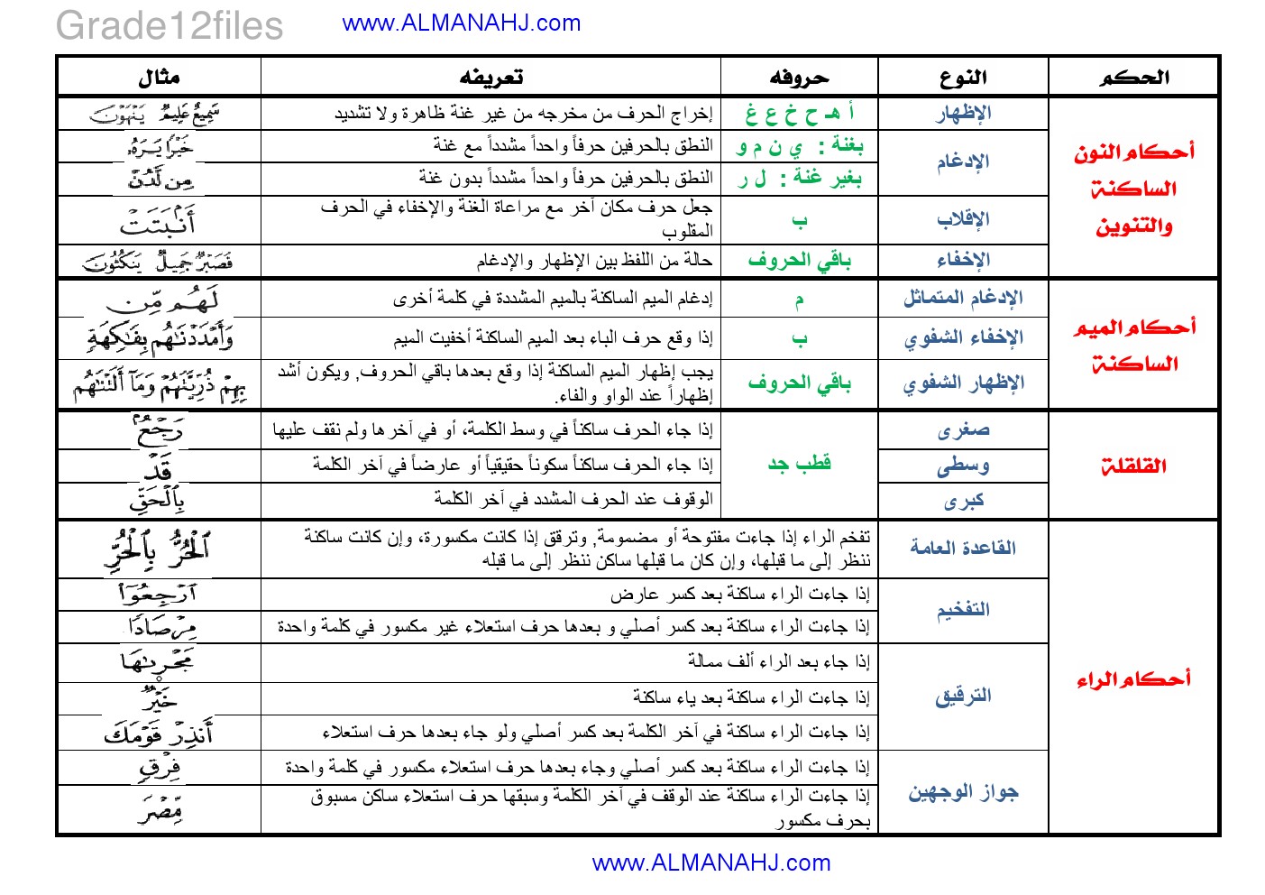 تفاصيل الخبر: الصف الثاني عشر, الفصل الثالث, 2017-2018, ملخص أحكام التجويد في صفحتين | |||