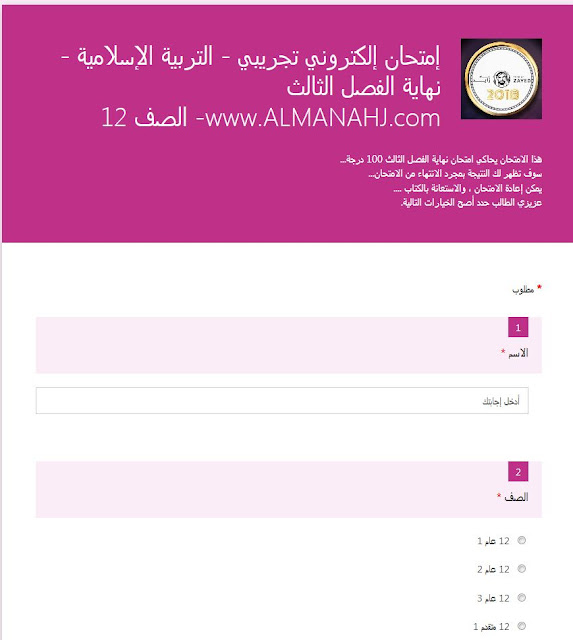 معلومات الملف: الصف الثاني عشر, الفصل الثالث, تربية اسلامية, 2017-2018, امتحان الكتروني تجريبي | ||