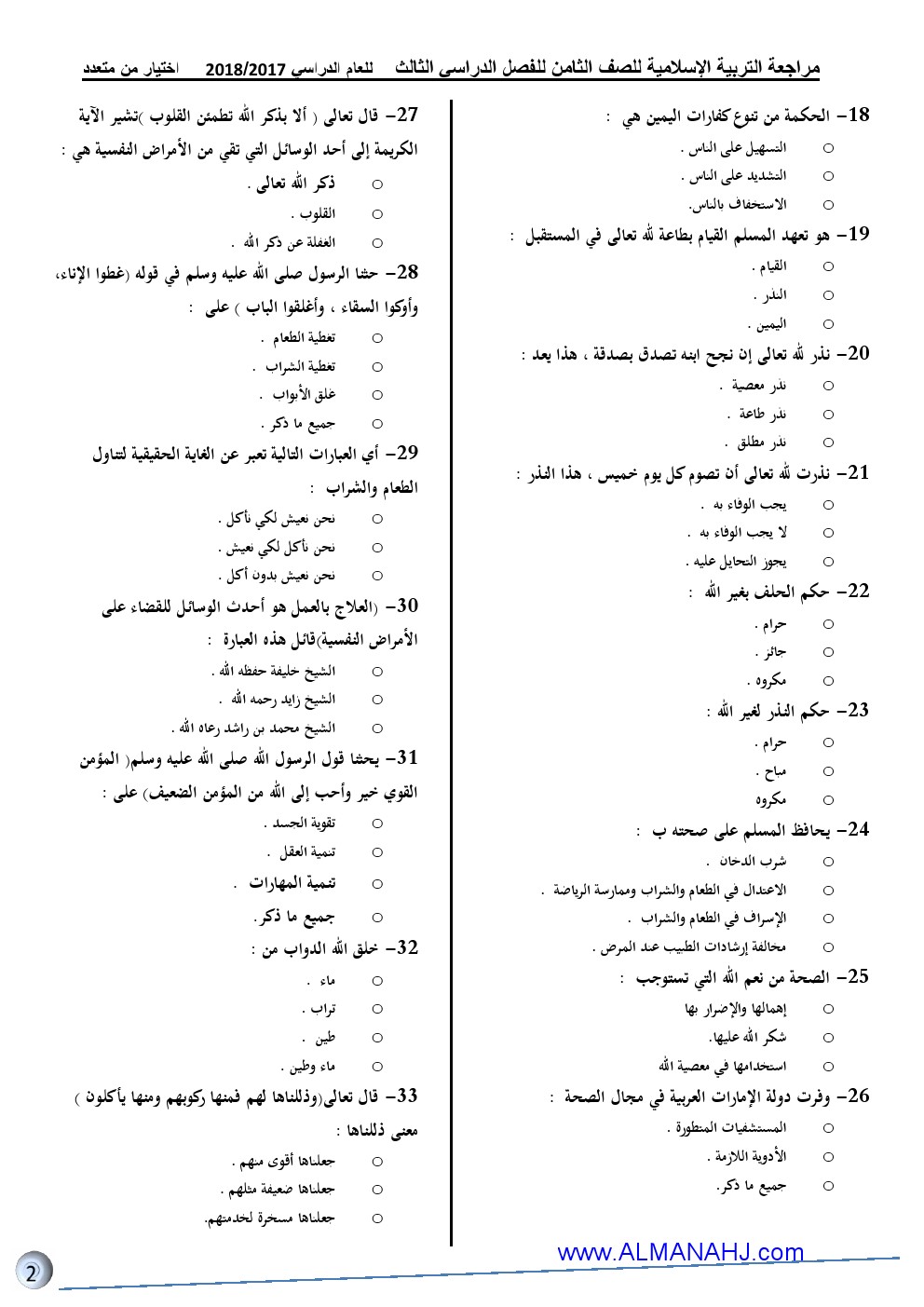 معلومات الملف: الصف الثامن, الفصل الثالث, تربية اسلامية, 2017-208, اختبار من 4 صفحات - اختيار من متعدد | |||