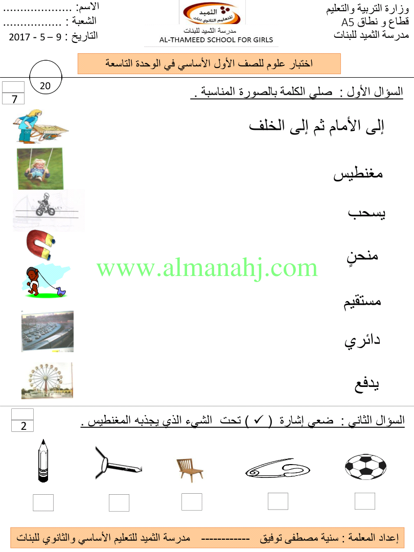 معلومات الملف: الصف الأول, الفصل الثالث, علوم, 2017-2018, اختبار في الوحدة9 | |||