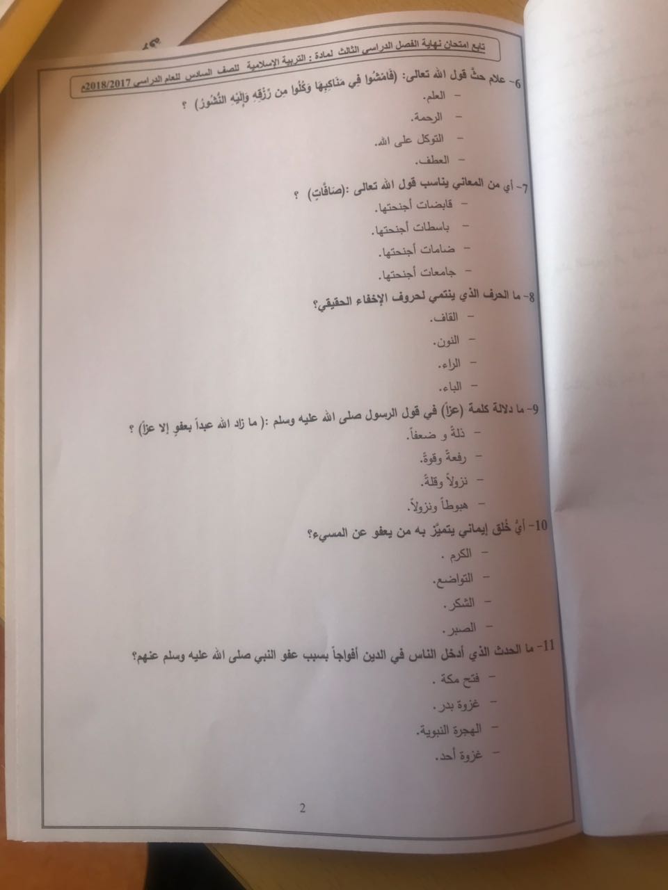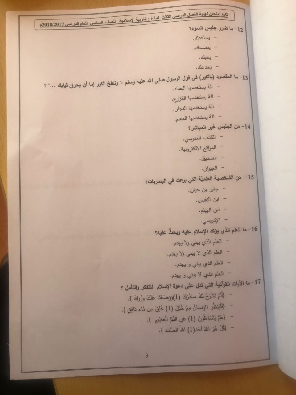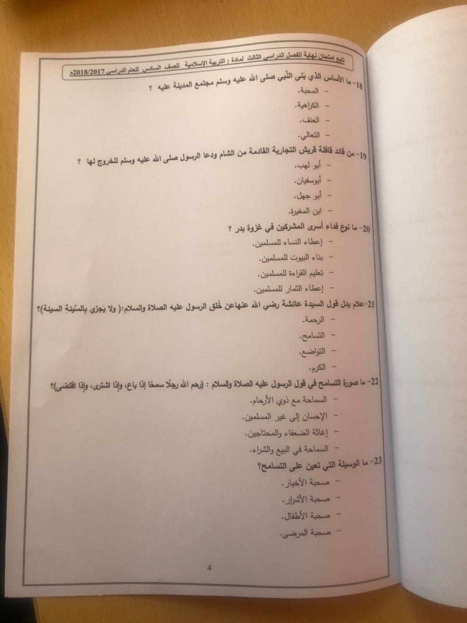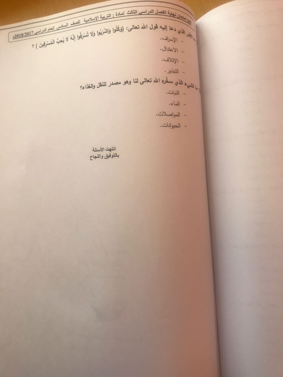 معلومات الملف: الصف السادس, الفصل الثالث, تربية اسلامية, 2017-2018, امتحان نهاية الفصل الثالث لعام2017-2018 | ||
