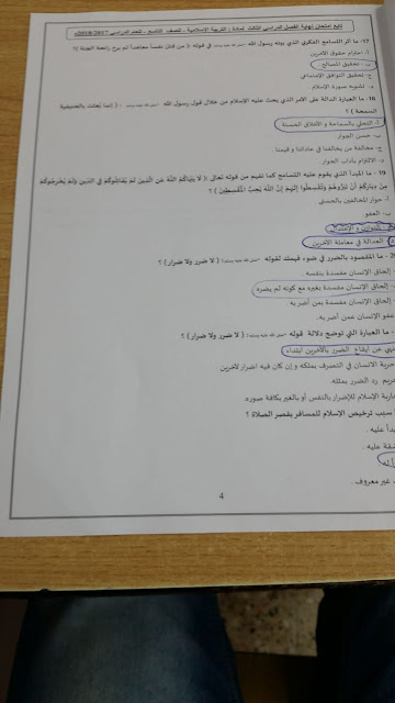 الصف التاسع, الفصل الثالث, تربية اسلامية, 2017-2018, امتحان نهاية الفصل الثالث لعام 2017-2018