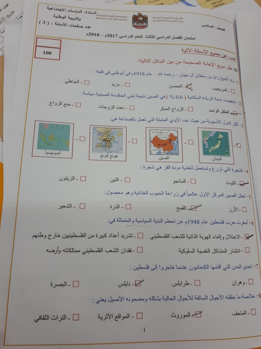 معلومات الملف: الصف السادس, الفصل الثالث, اجتماعيات, 2017-2018, امتحان نهاية الفصل الثالث لعام 2017-2018 | ||