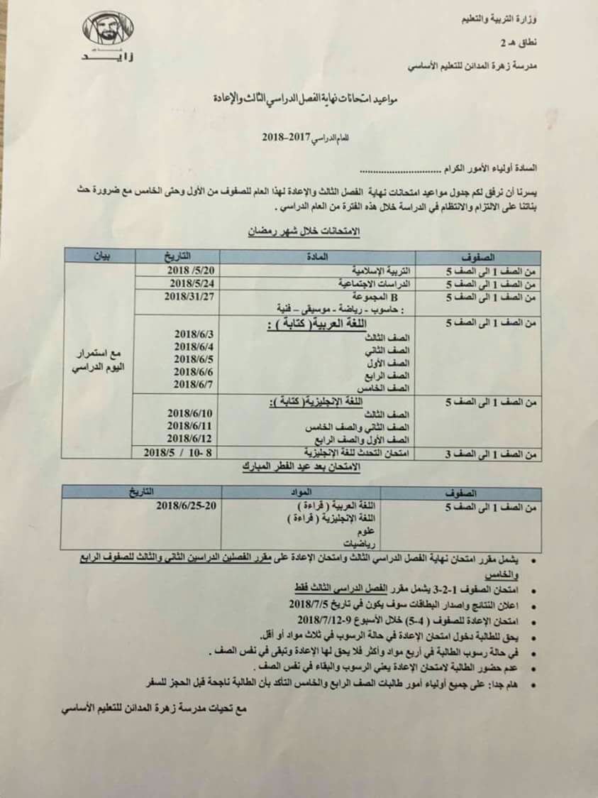 معلومات الملف: جدول الامتحانات النهائية للصفوف من الأول وحتى الخامس 2017-2018 وذلك بحسب مدرسة زهرة المدائن | ||