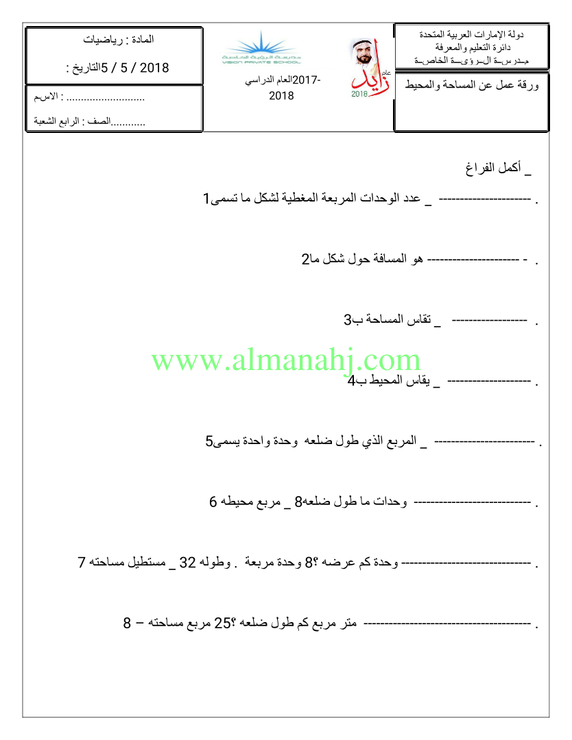 معلومات الملف: الصف الرابع, الفصل الثالث, رياضيات, 2017-2018, ورقة عمل المساحة والمحيط | |||