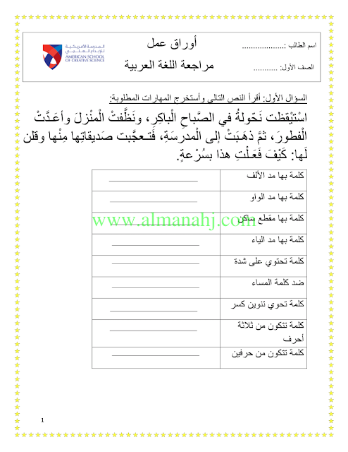 معلومات الملف: الصف الأول, الفصل الثالث, لغة عربية, 2017-2018, اوراق عمل مراجعة | |||