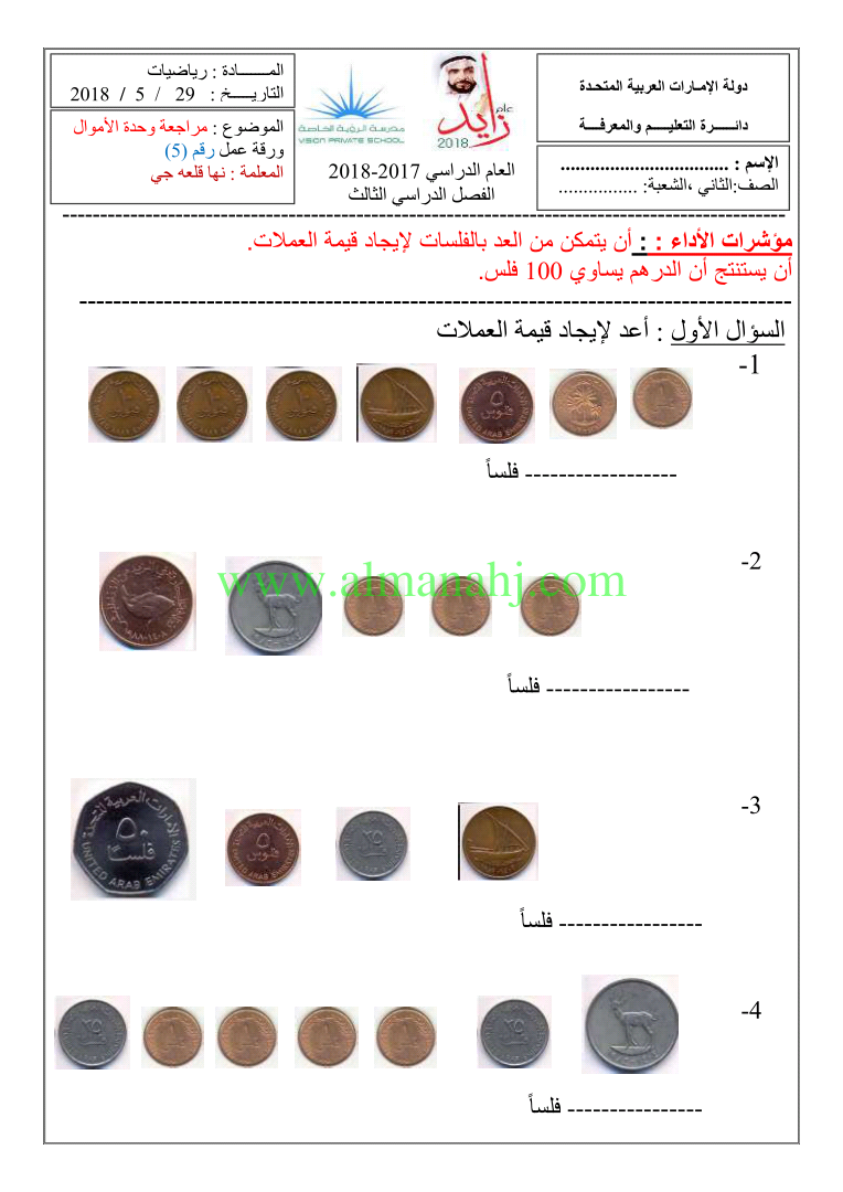 معلومات الملف: الصف الثاني, الفصل الثالث, رياضيات, 2017-2018, ورقة عمل وحدة الاموال | |||
