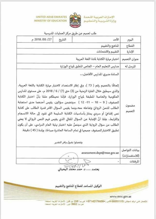 معلومات الملف: تعميم بخصوص الامتحان الكتابي في مادة اللغة العربية للصفوف من 9 حتى 12 | ||