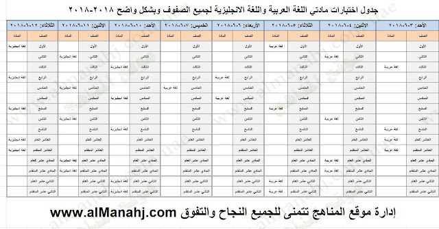 جدول اختبارات مادتي اللغة العربية واللغة الانجليزية لجميع الصفوف وبشكل واضح 2017-2018