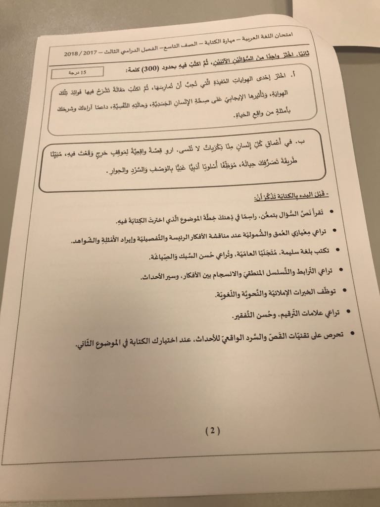 معلومات الملف: الصف التاسع, الفصل الثالث, لغة عربية, 2017-2018, امتحان لغة عربية مهارة الكتابة الفصل الدراسي الثالث لعام 2017-2018 | ||