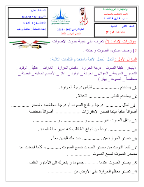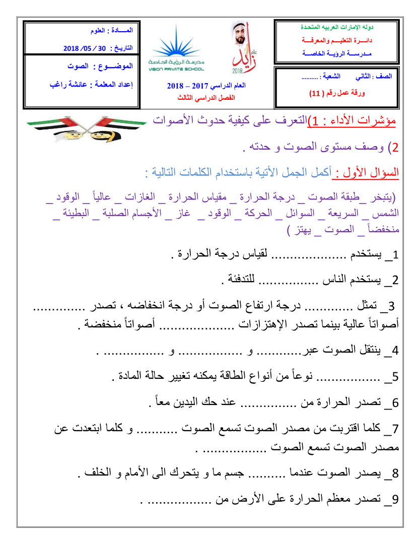 معلومات الملف: الصف الثاني, الفصل الثالث, علوم, 2017-2018, ورقة عمل الصوت | |||