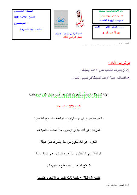 معلومات الملف: الصف الثاني, الفصل الثالث, علوم, 2017-2018, ورقة عمل استخدام الالات البسيطة | |||