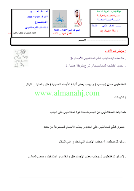 معلومات الملف: الصف الثاني, الفصل الثالث, علوم, 2017-2018, ورقة عمل استكشاف قطع المغناطيس | |||
