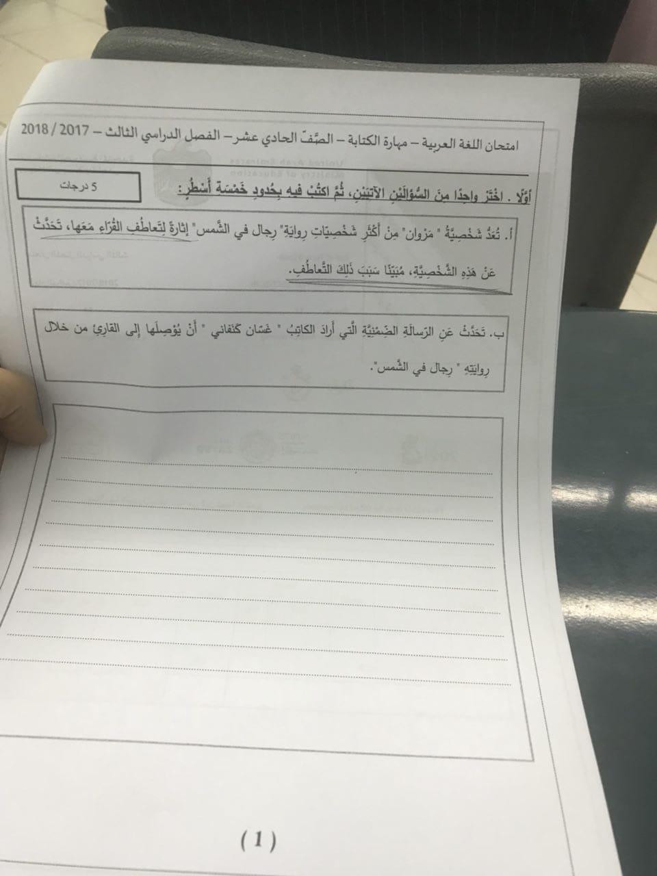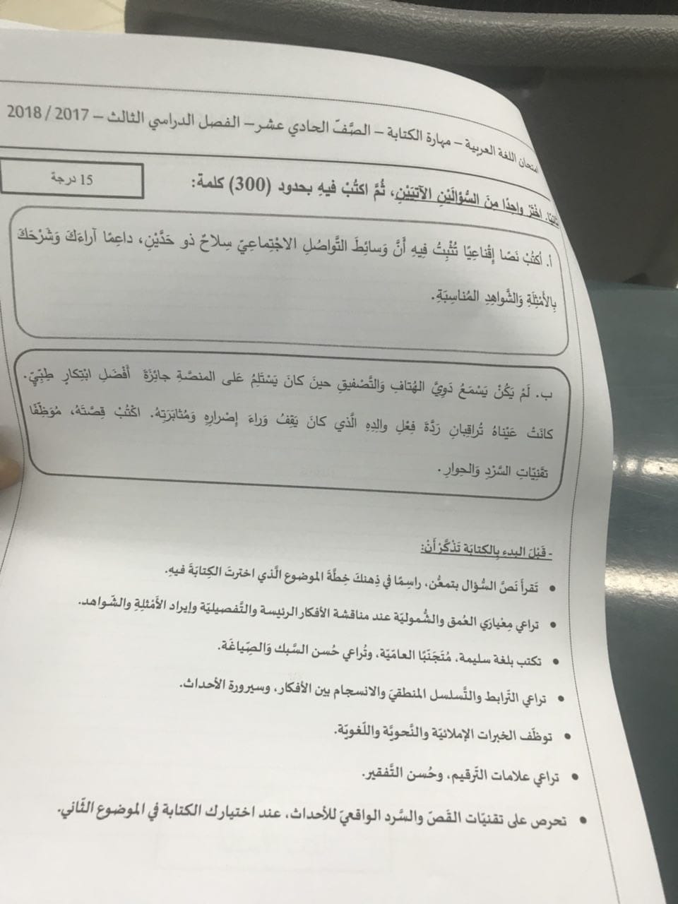 معلومات الملف: الصف الحادي عشر, الفصل الثالث, لغة عربية, 2017-2018, امتحان اللغة العربية مهارة الكتابة الفصل الدراسي الثالث لعام 2017-2018 | ||
