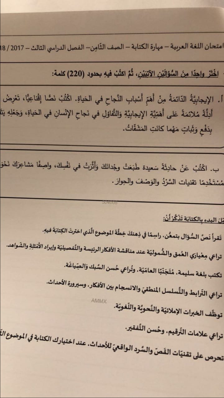معلومات الملف: الصف الثامن, الفصل الثالث, لغة عربية, 2017-2018, امتحان اللغة العربية مهارة الكتابة الفصل الدراسي الثالث لعام 2017-2018 | ||