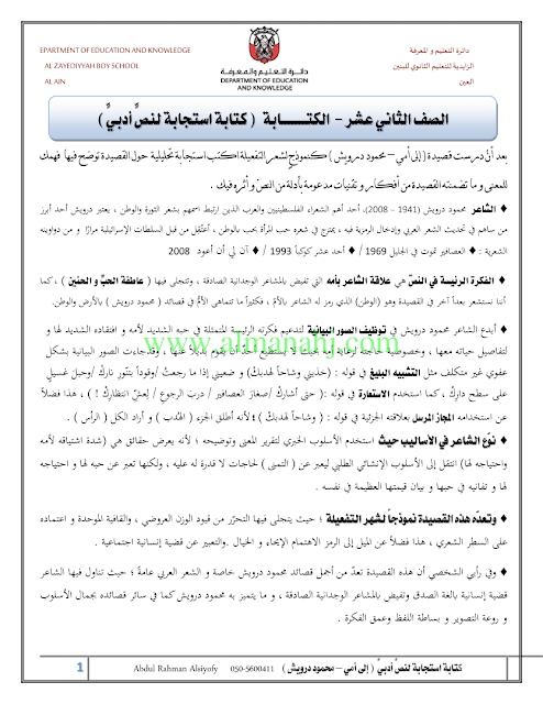معلومات الملف: الصف الثاني عشر, الفصل الثالث, لغة عربية, 2017-2018, كتابة استجابة لنص ادبي | |||