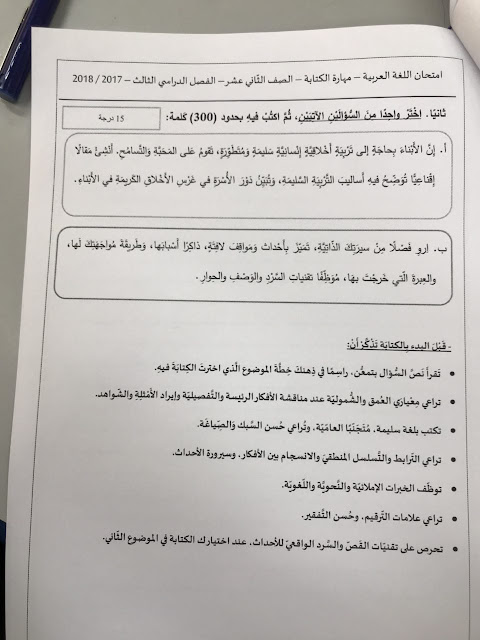 معلومات الملف: الصف الثاني عشر, الفصل الثالث, لغة عربية, 2017-2018, امتحان لغة عربية مهارة الكتابة الفصل الدراسي الثالث لعام 2017-2018 | ||