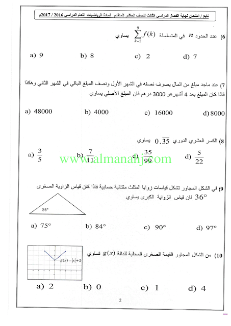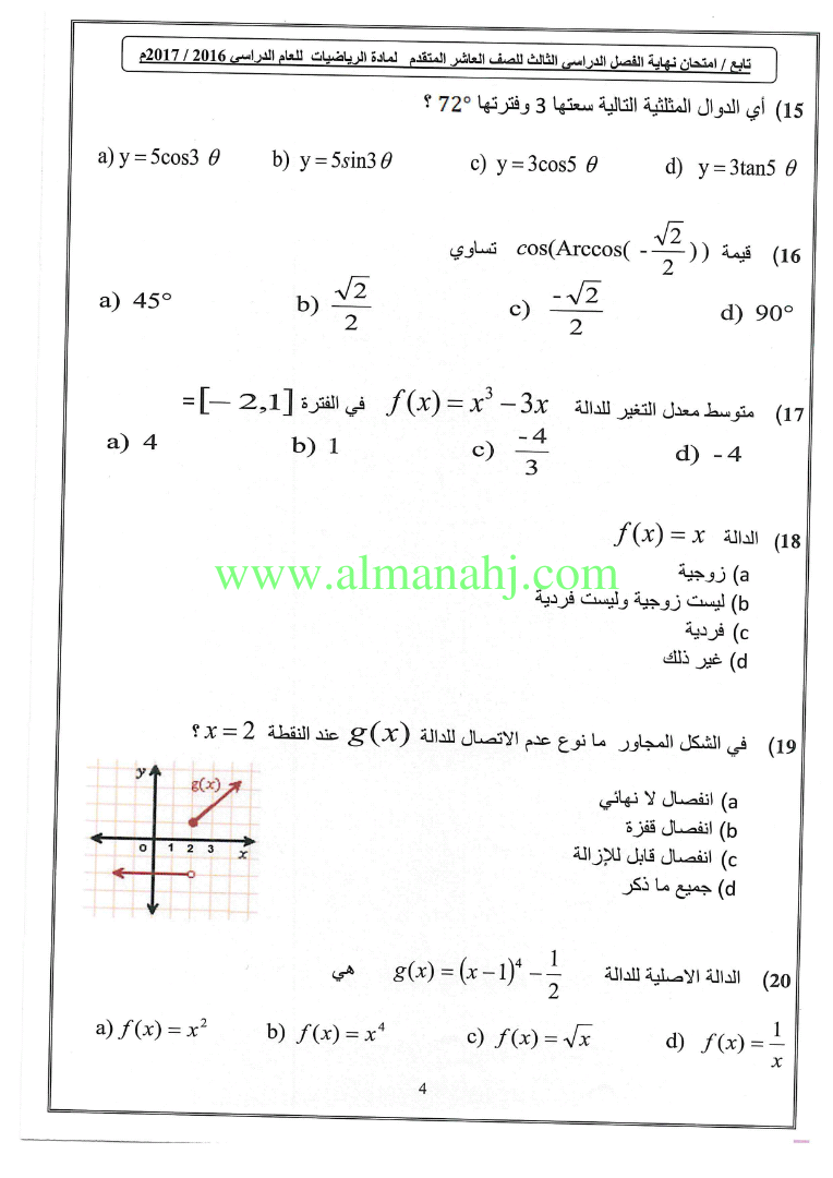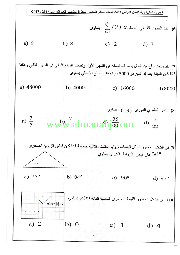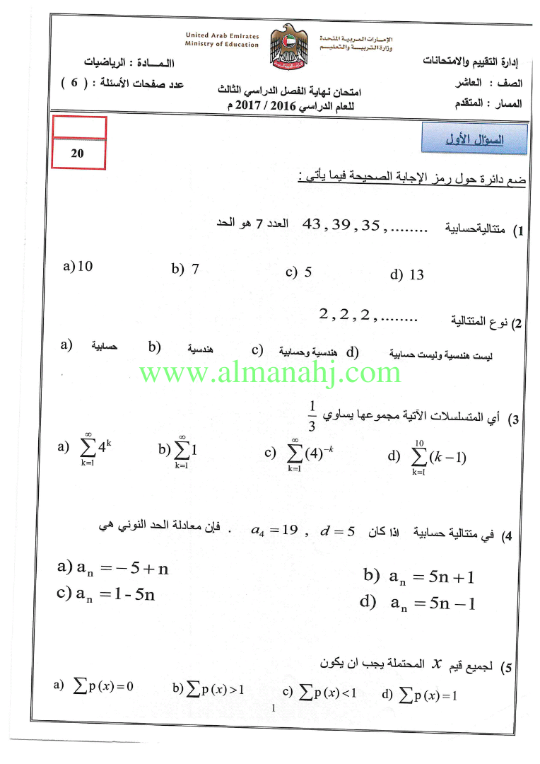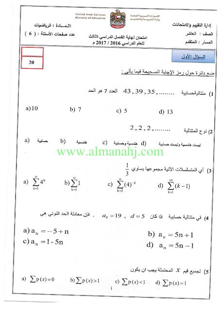 معلومات الملف: الصف العاشر المتقدم, الفصل الثالث, رياضيات, 2017-2018, امتحان نهاية العام 2017-2018 | |||