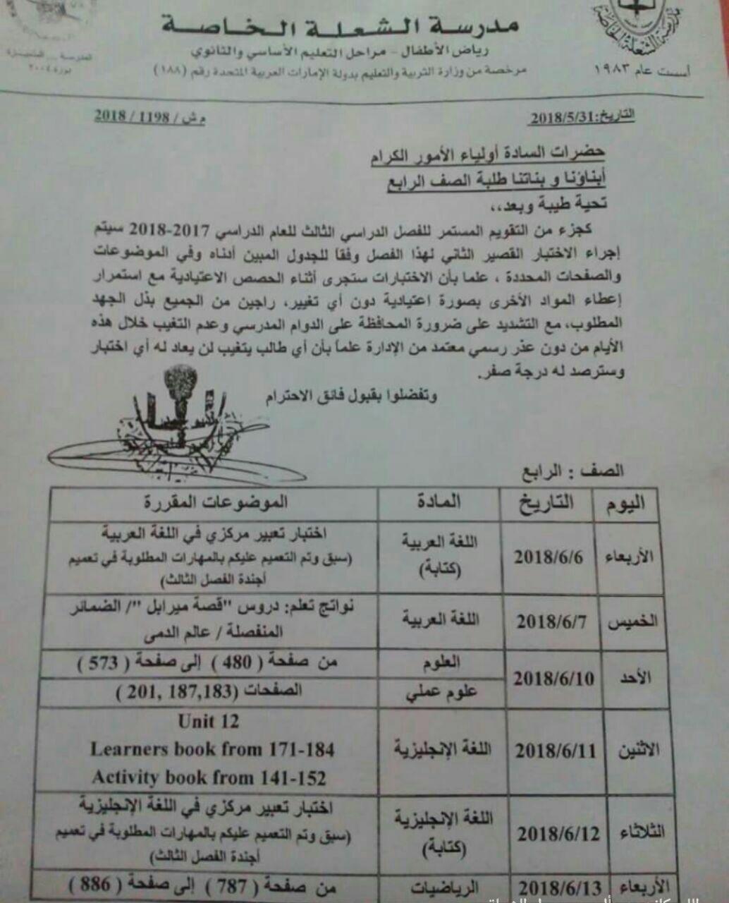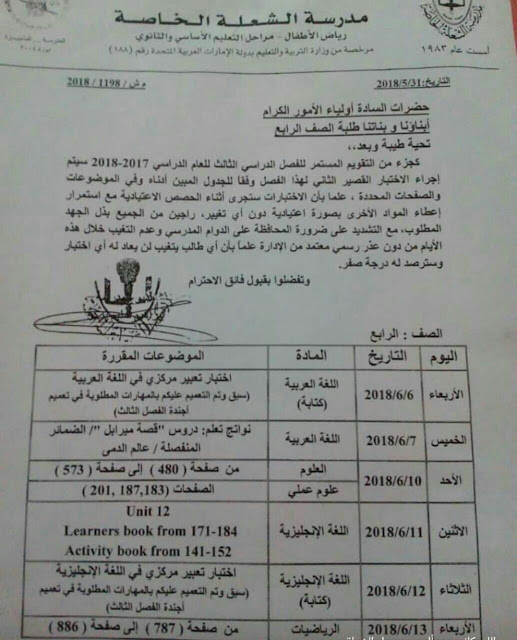 جدول الامتحانات في مدرسة الشعلة الخاصة مع المقررات | ||
