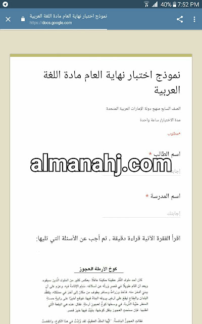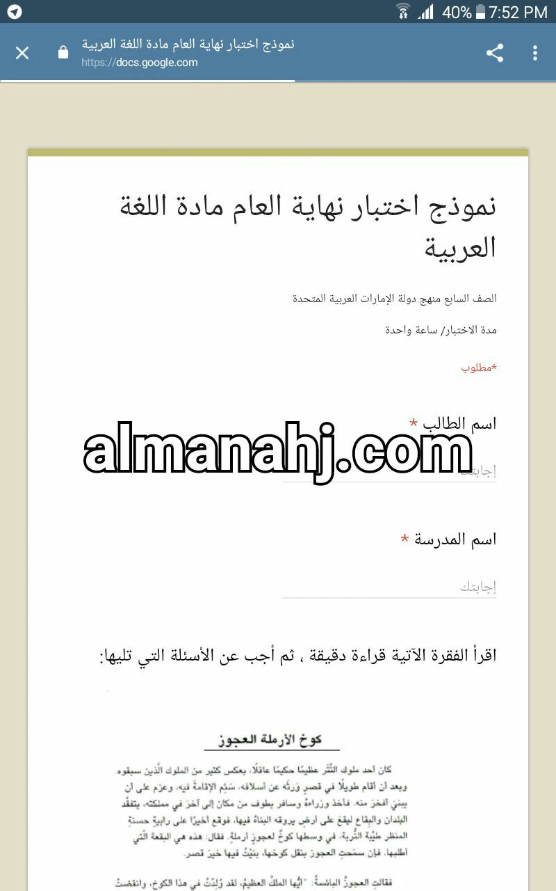 معلومات الملف: الصف السابع, الفصل الثالث, لغة عربية, 2017-2018,نموذجاختبار نهاية العام | ||