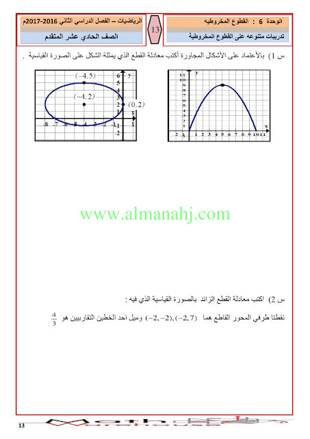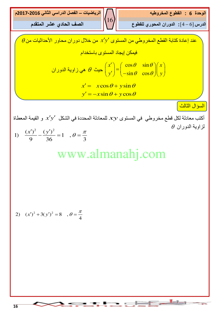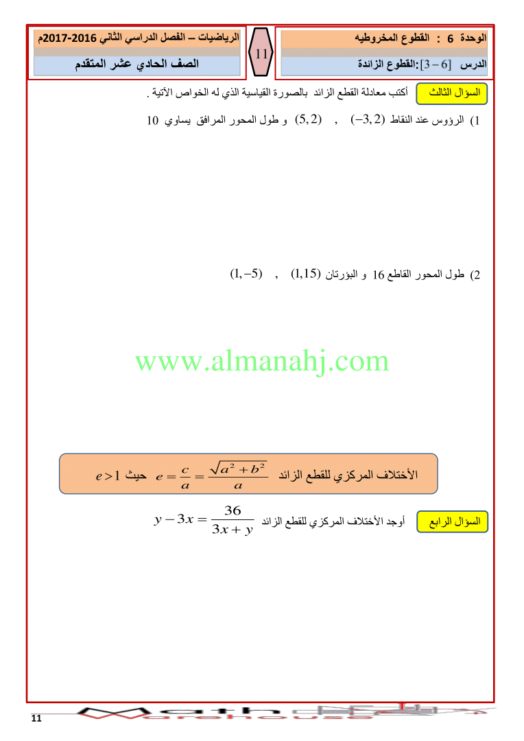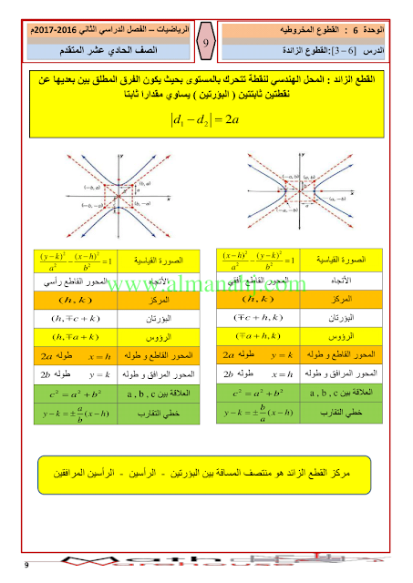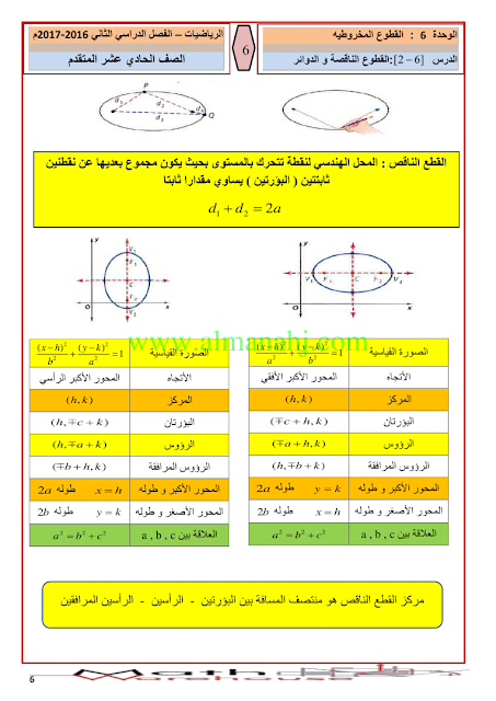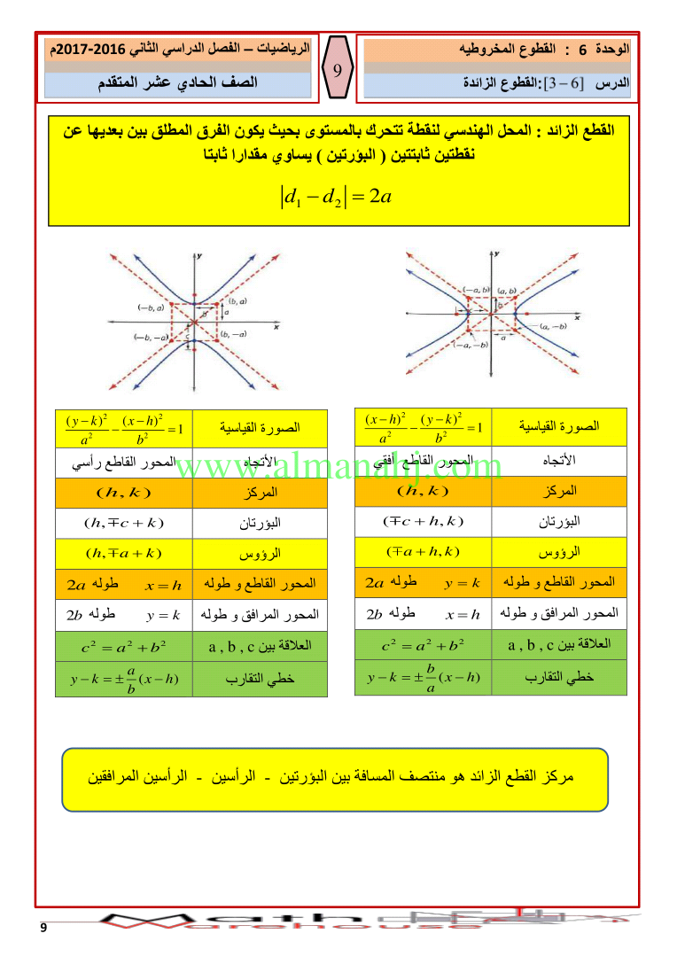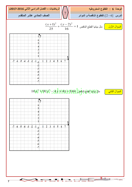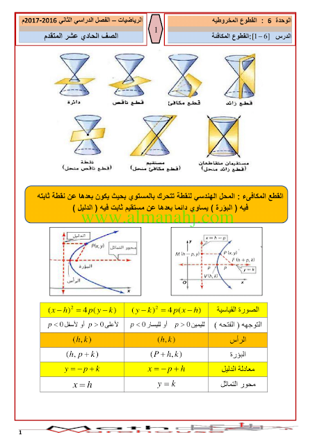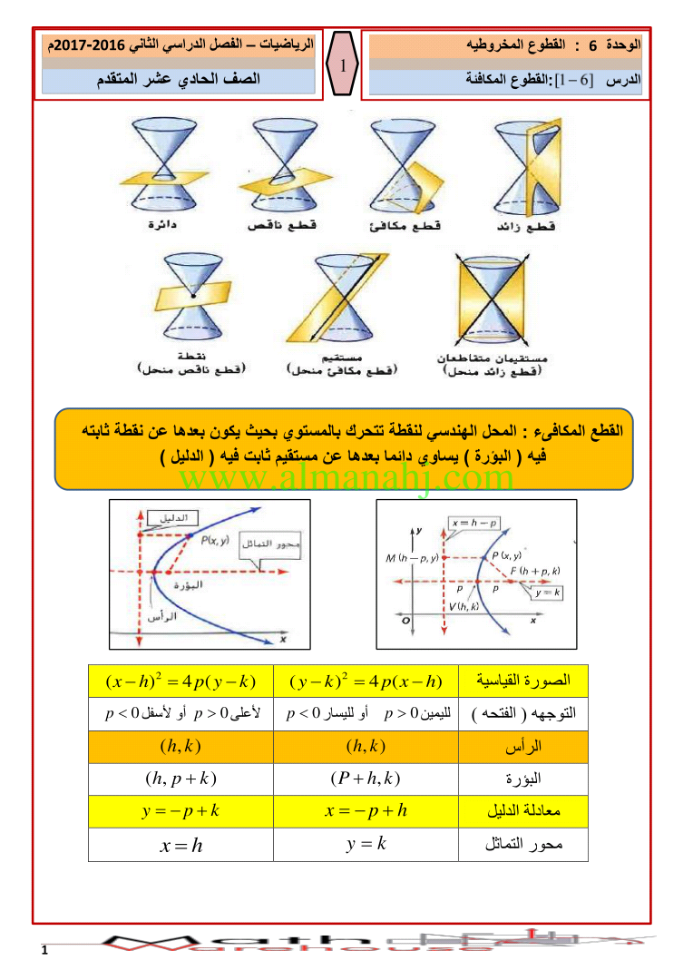 معلومات الملف: الصف الحادي عشر المتقدم, الفصل الثاني, رياضيات, 2017-2018, اسئلة مراجعة لوحدة قطوع - المخروطية | |||