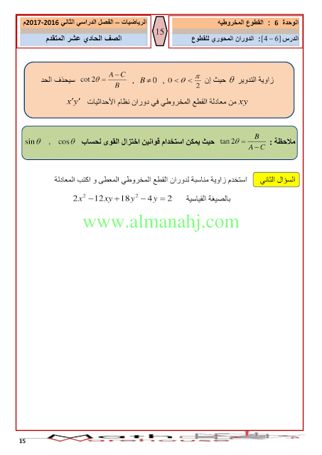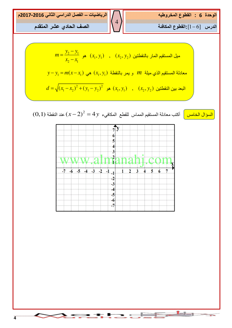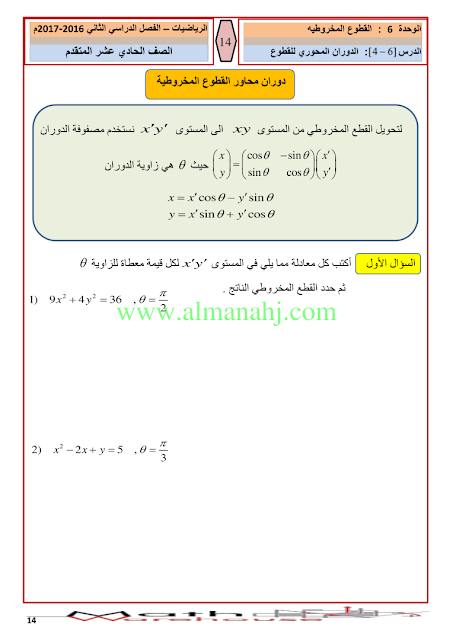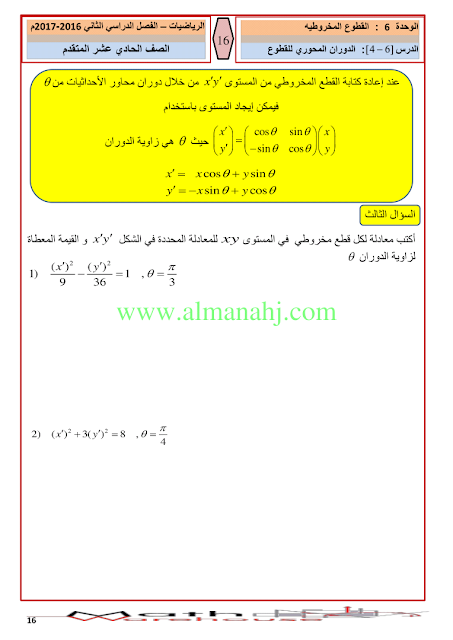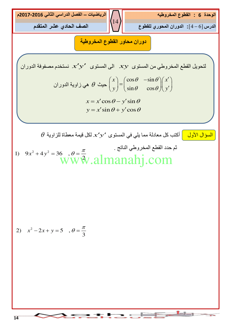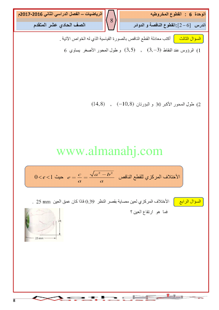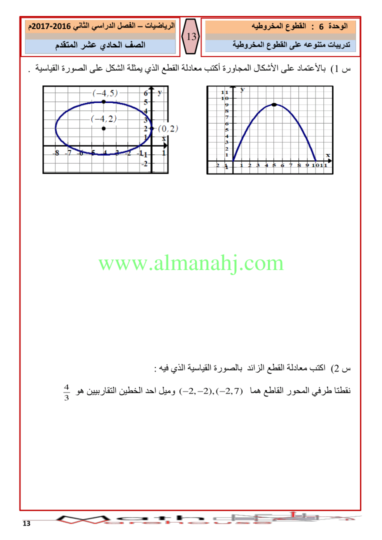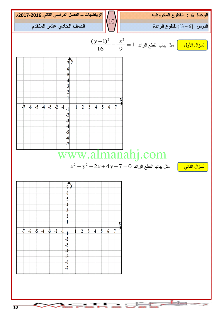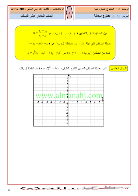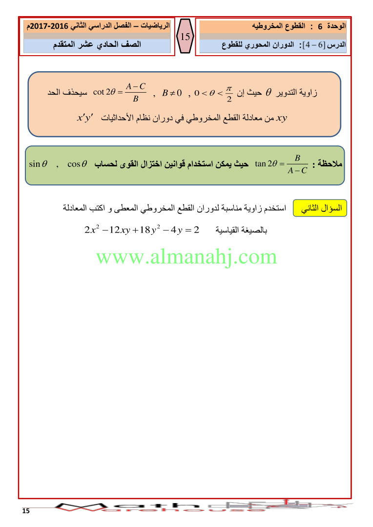 معلومات الملف: الصف الحادي عشر المتقدم, الفصل الثاني, رياضيات, 2017-2018, اسئلة مراجعة لوحدة قطوع - المخروطية | |||
