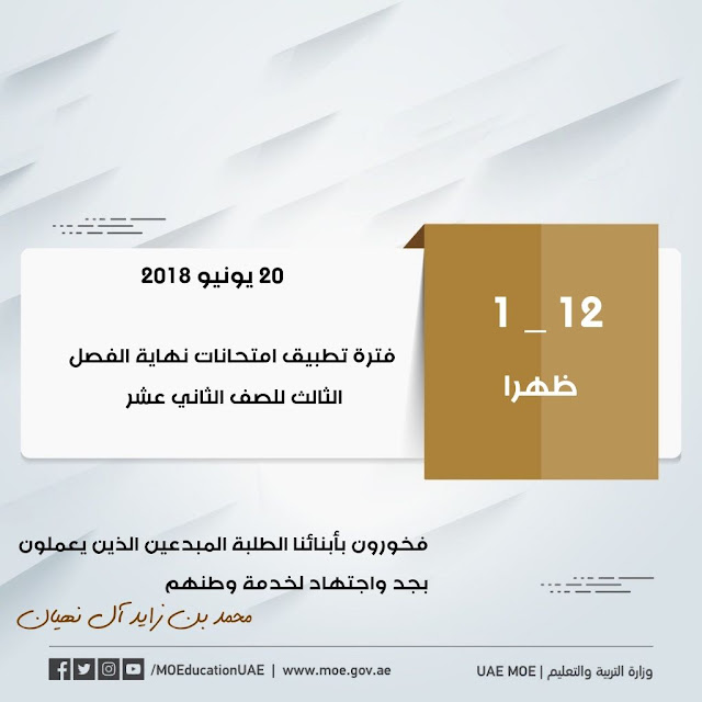 حددت وزارة التربية والتعليم في الامارات العربية المتحدة عبر حسابها على تلغرام فترة تطبيق امتحانات نهاية الفصل الثالث للصف الثاني عشر 2017-2018 ومدتها ساعة واحدة فقط
