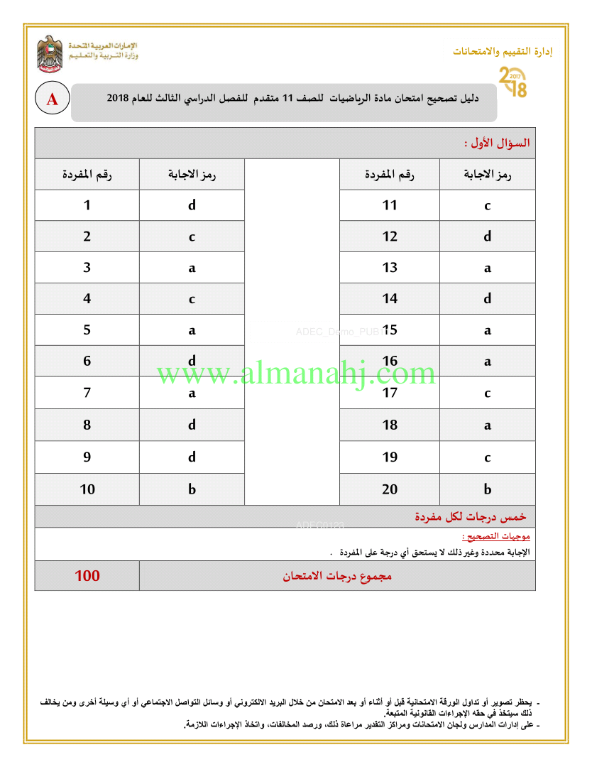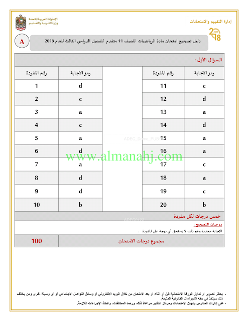 معلومات الملف: الصف الحادي عشر المتقدم, الفصل الثالث, رياضيات, 2017-2018,نموذجاجوبة الامتحان | |||