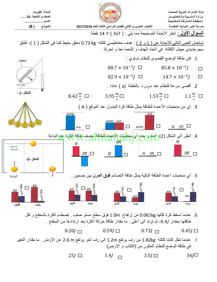معلومات الملف: الصف العاشر المتقدم, الفصل الثالث, فيزياء, 2017-2018, الاختبار التحريري الثاني للفصل الثالث | |||