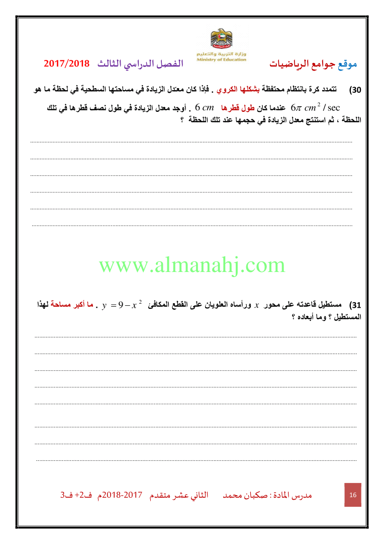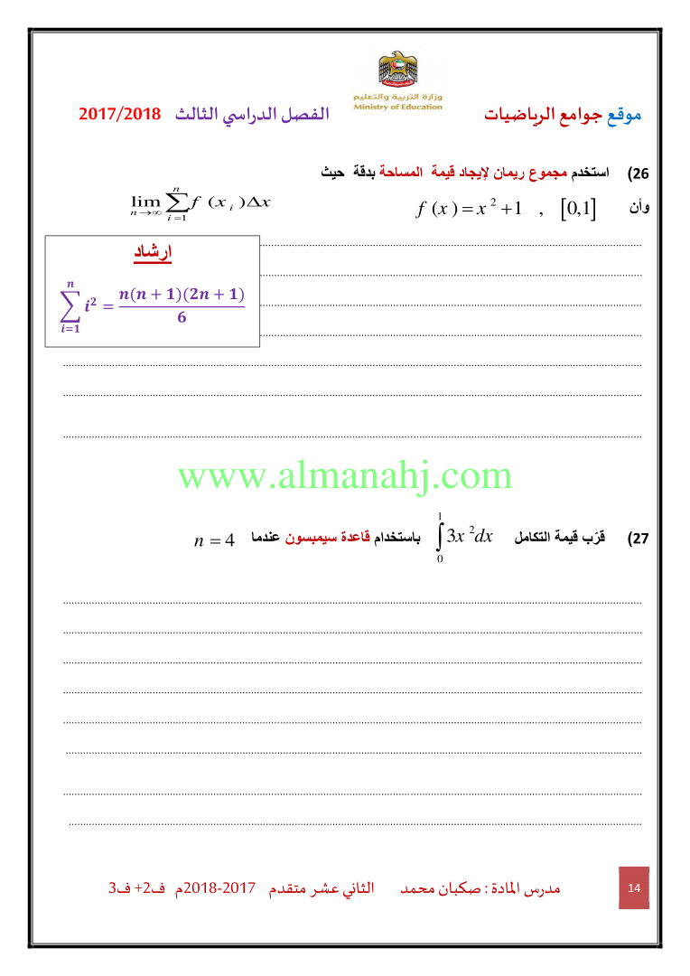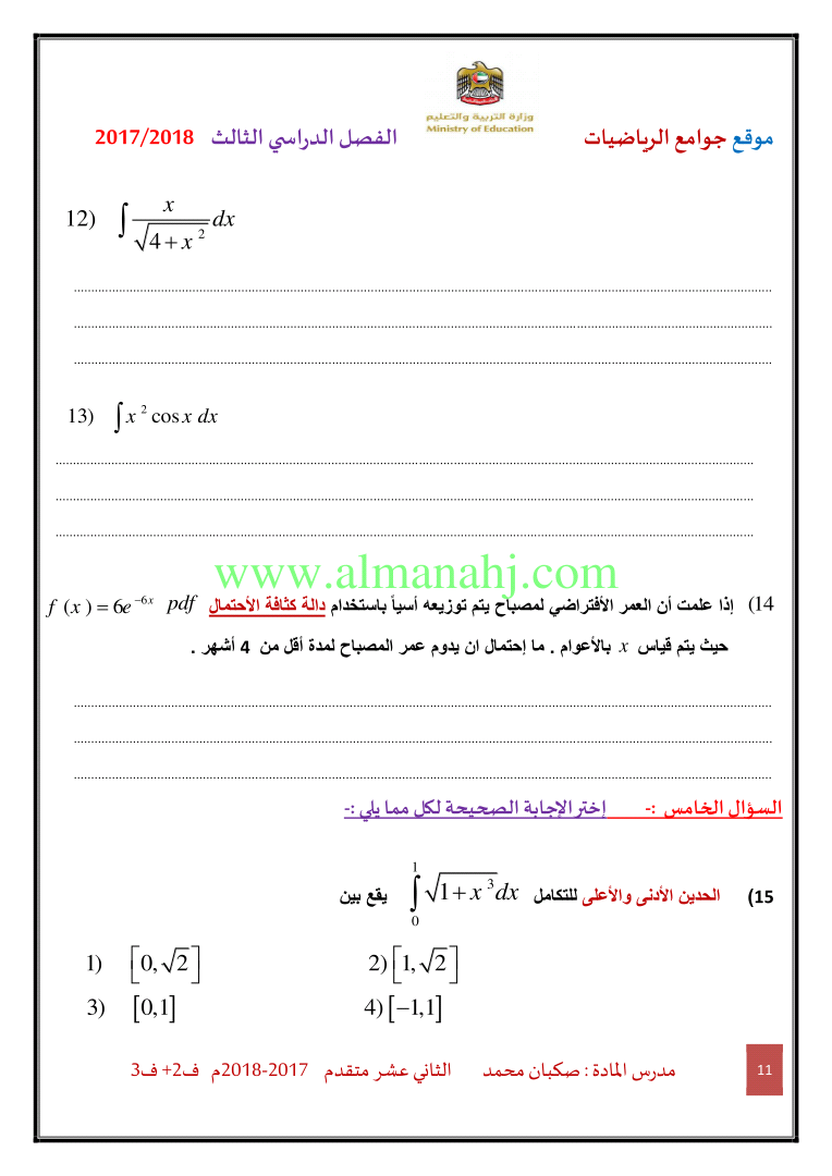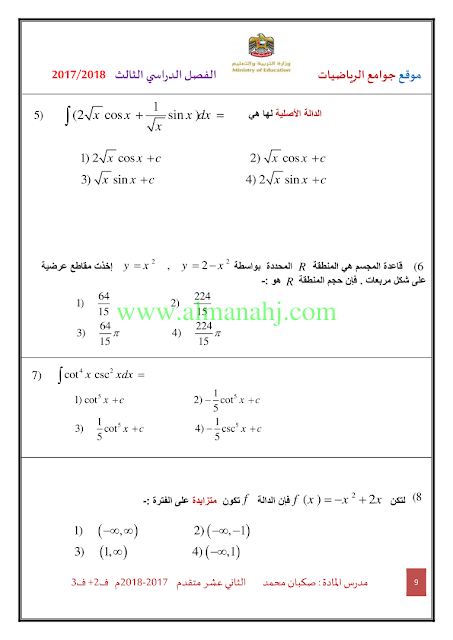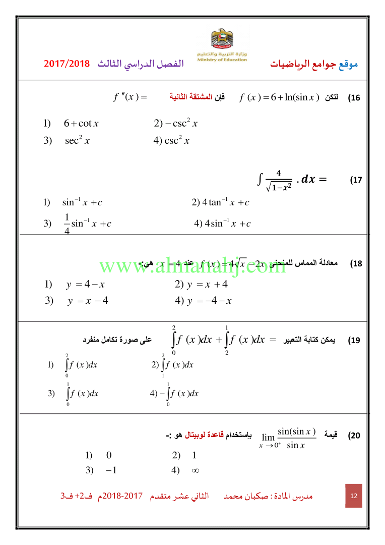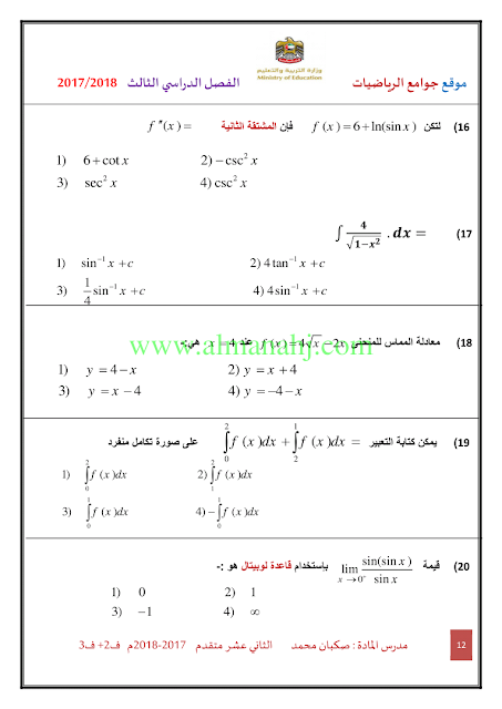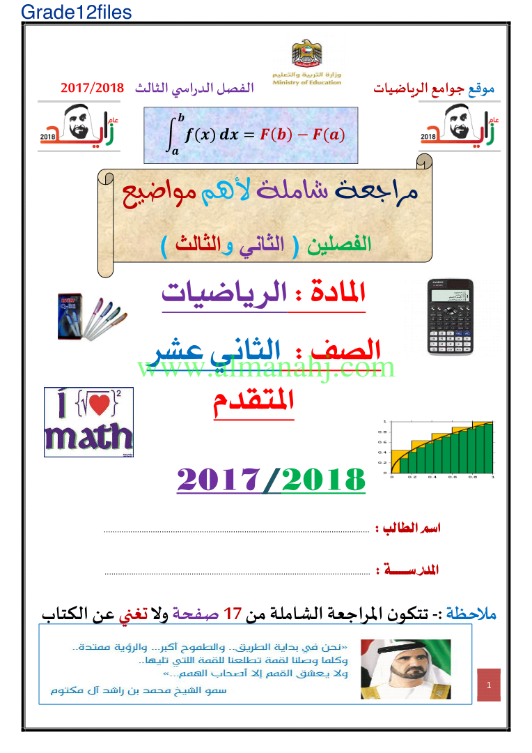 معلومات الملف: الصف الثاني عشر المتقدم, الفصل الثالث, رياضيات, 2017-2018, ملزمة رياضيات الفصلين الثاني والثالث | |||