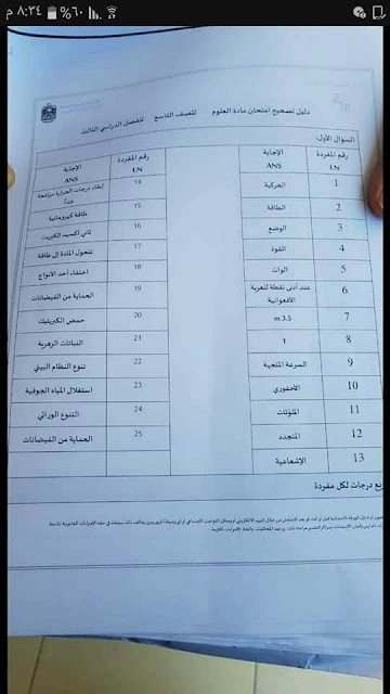 معلومات الملف: الصف التاسع, الفصل الثالث, علوم, 2017-2018, دليل تصحيح امتحان العلوم | ||