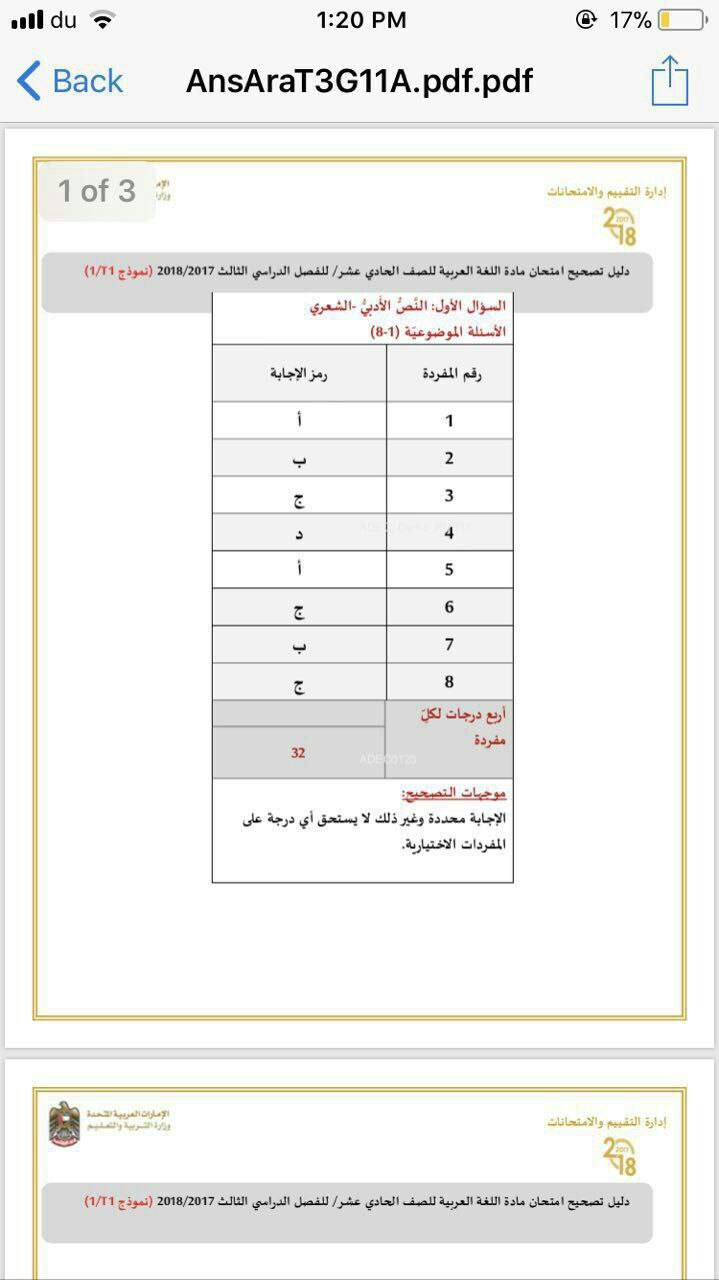 معلومات الملف: الصف الحادي عشر, الفصل الثالث, لغة عربية, 2017-2018,نموذجتصحيح امتحان نهاية الفصل الثالث 2018 | ||