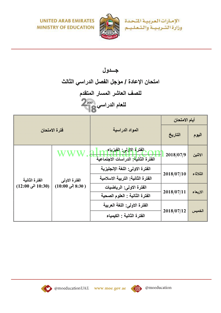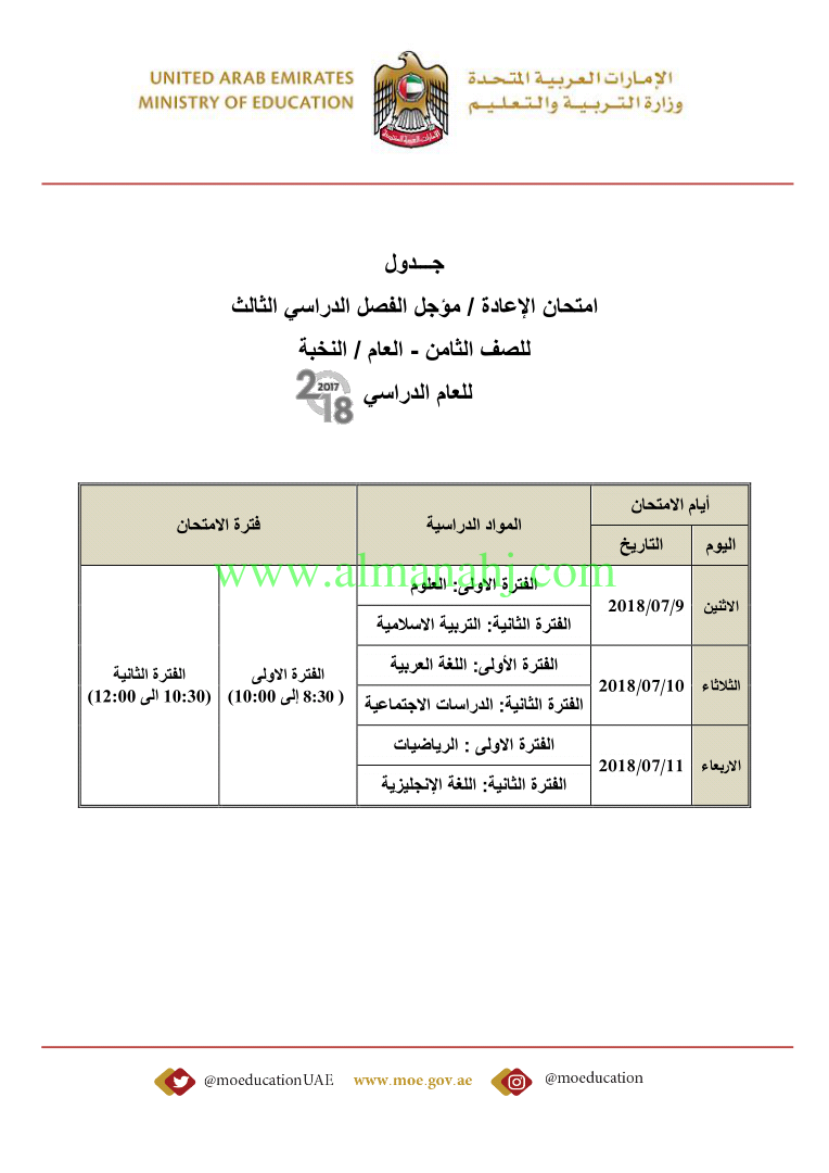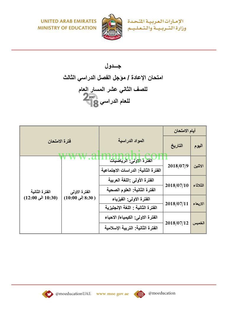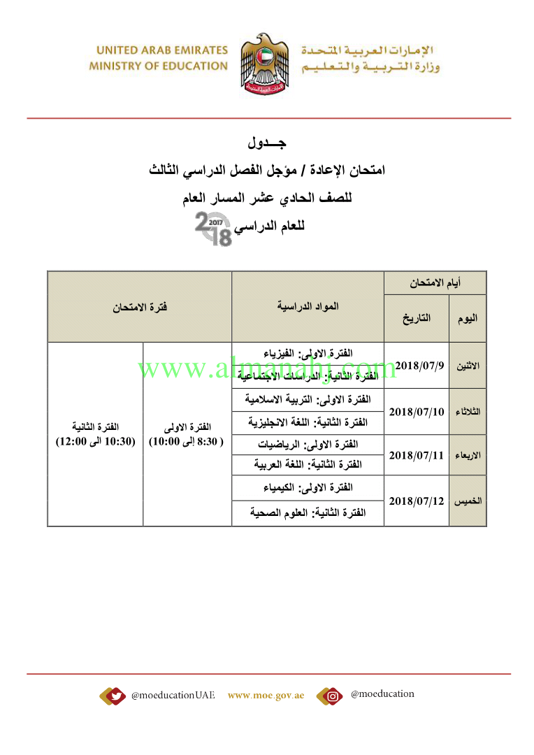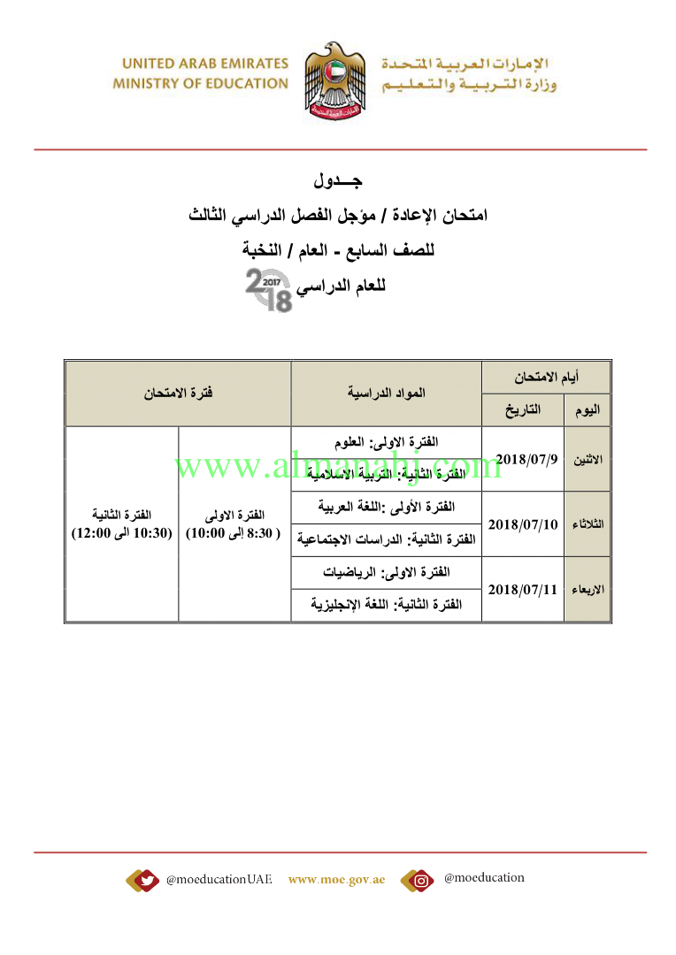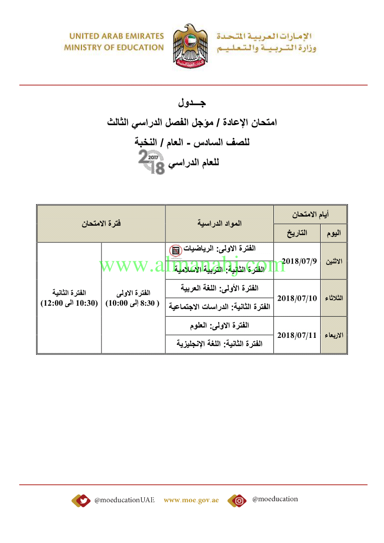 معلومات الملف: صدور جداول امتحانات المؤجل والإعادة لامتحانات نهاية اعام الدراسي 2017-2018 | |||
