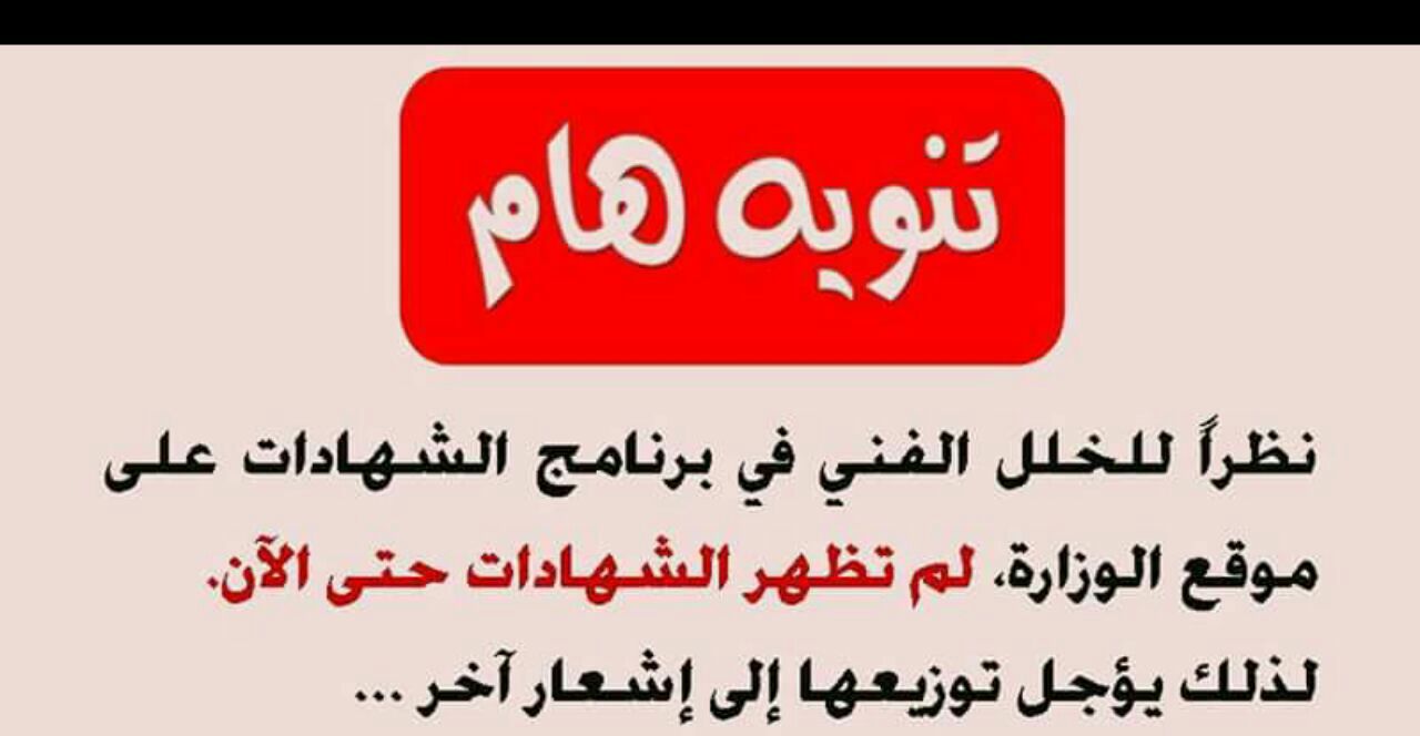 خلل فني في موقع الوزارة يؤدي الى تأجيل صدور الشهادات من أجل طباعتها حتى اشعار قريب ...