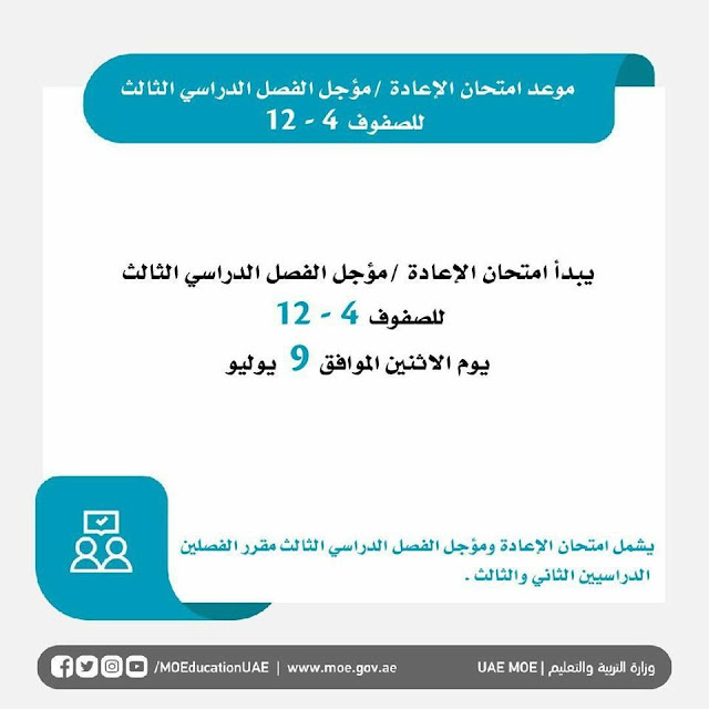 معلومات الملف: موعد بداية امتحان الاعادة و المؤجل من الصف 4-12 و يشمل مقرر الفصلين الثاني و الثالث | ||