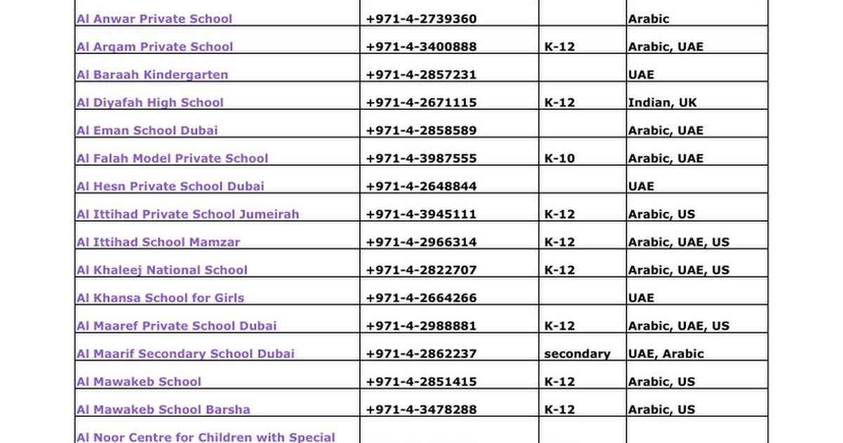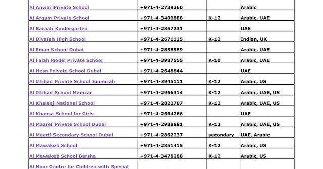 قائمة بأرقام هواتف مدارس دبي كاملة مع نوع المنهاج ونوع المدرسة | ||