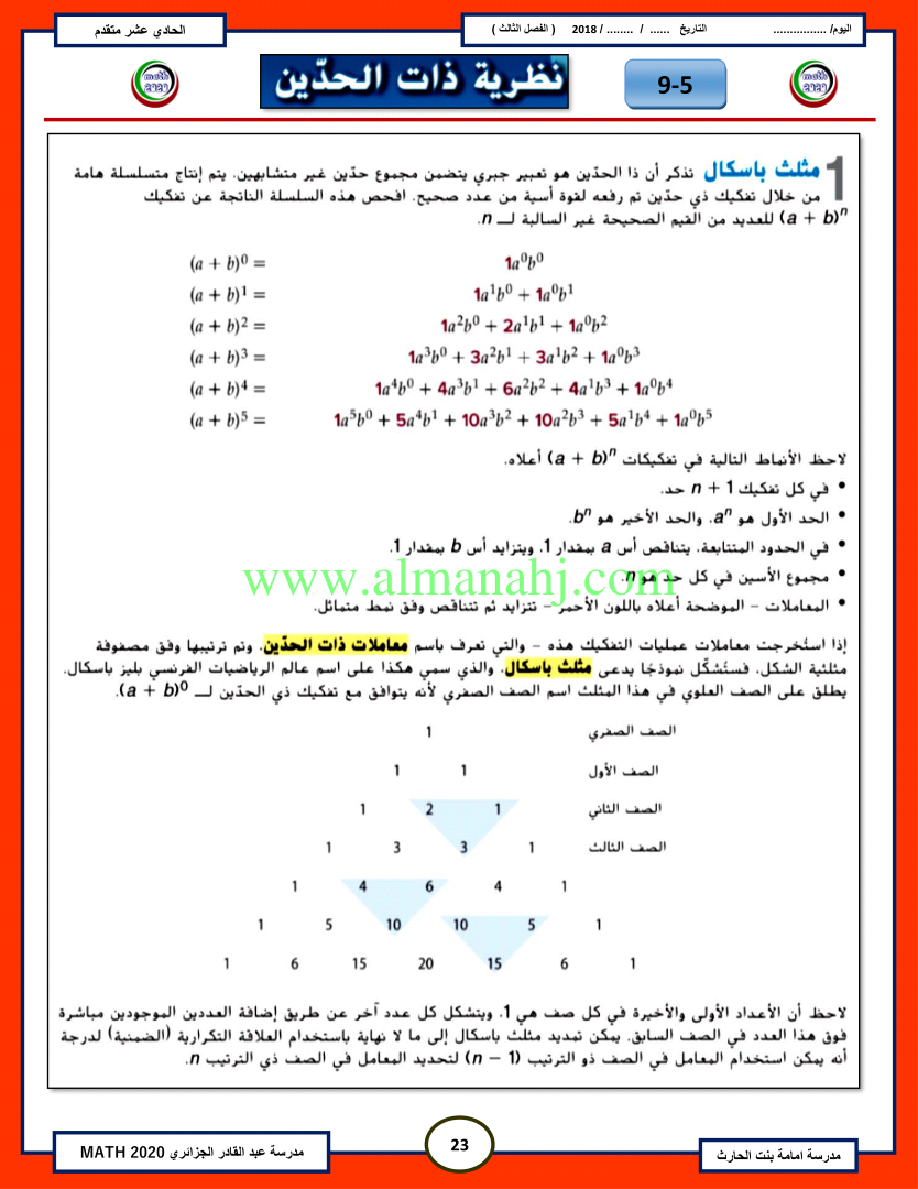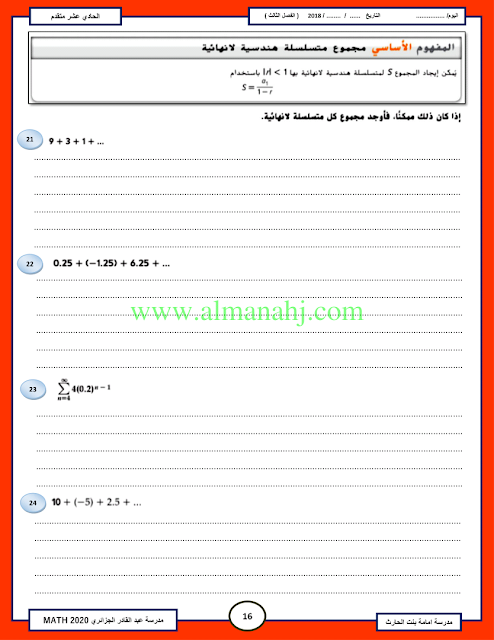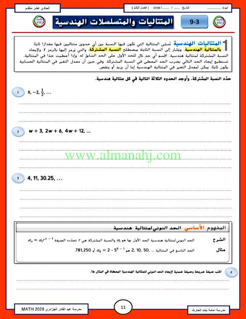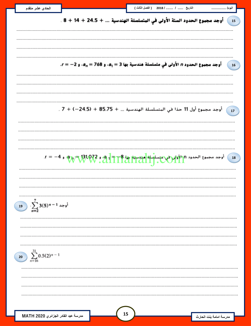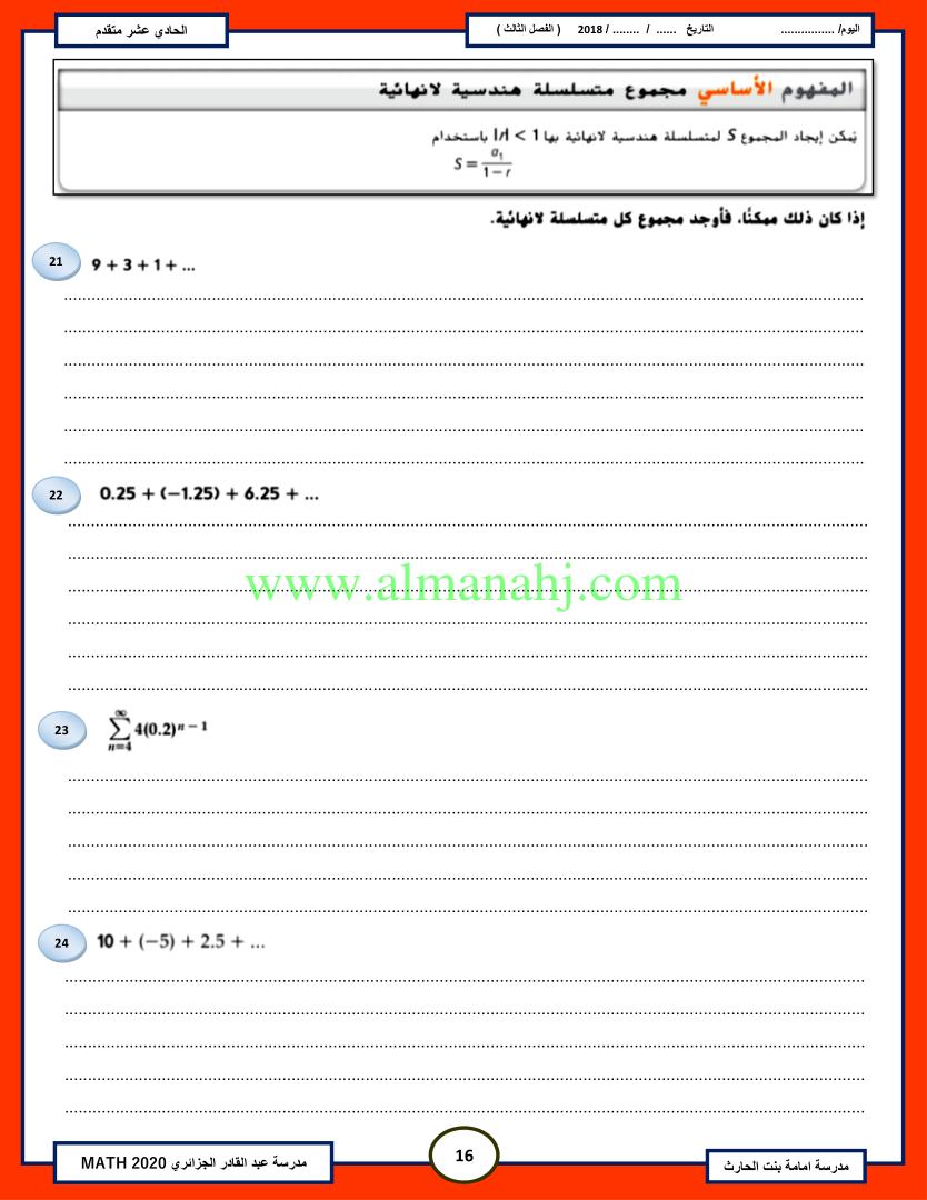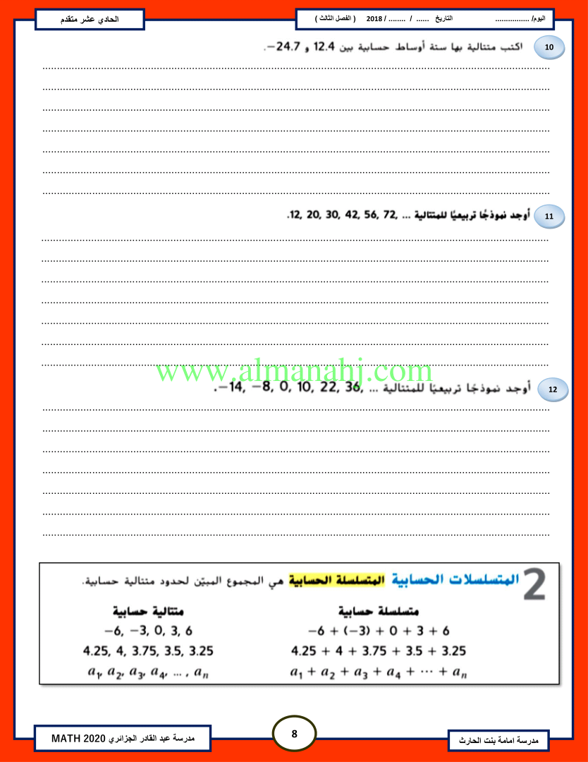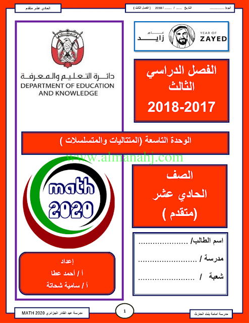 معلومات الملف: الصف الحادي عشر المتقدم, الفصل الثالث, رياضيات, 2017-2018, المتتاليات والمتسلسلات | |||