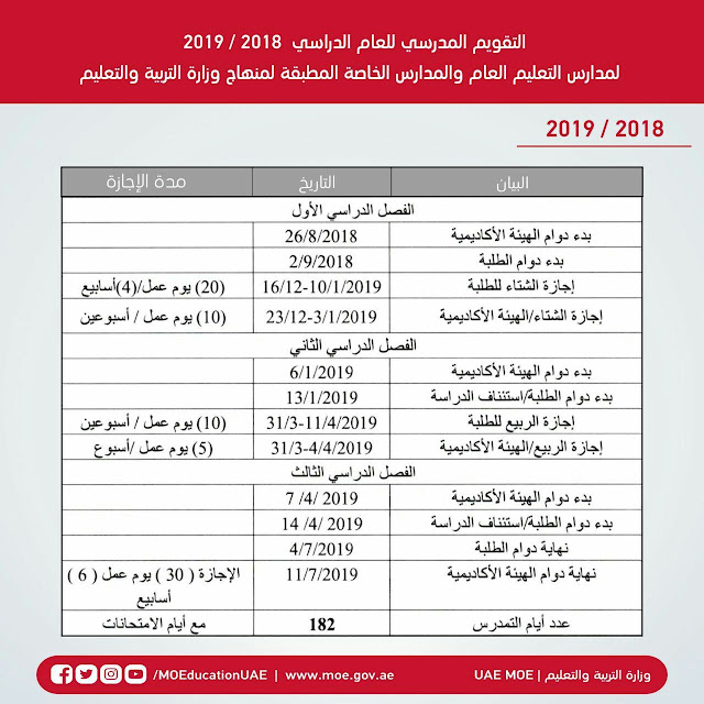 نشرت وزارة التربية والتعليم على حساباتها على مواقع التواصل الاجتماعي تقويم العام الدراسي 2018-2019 وجاء كالتالي